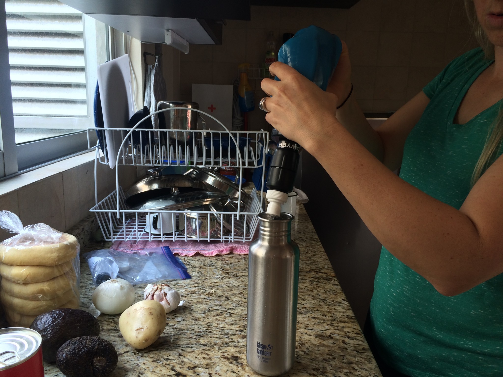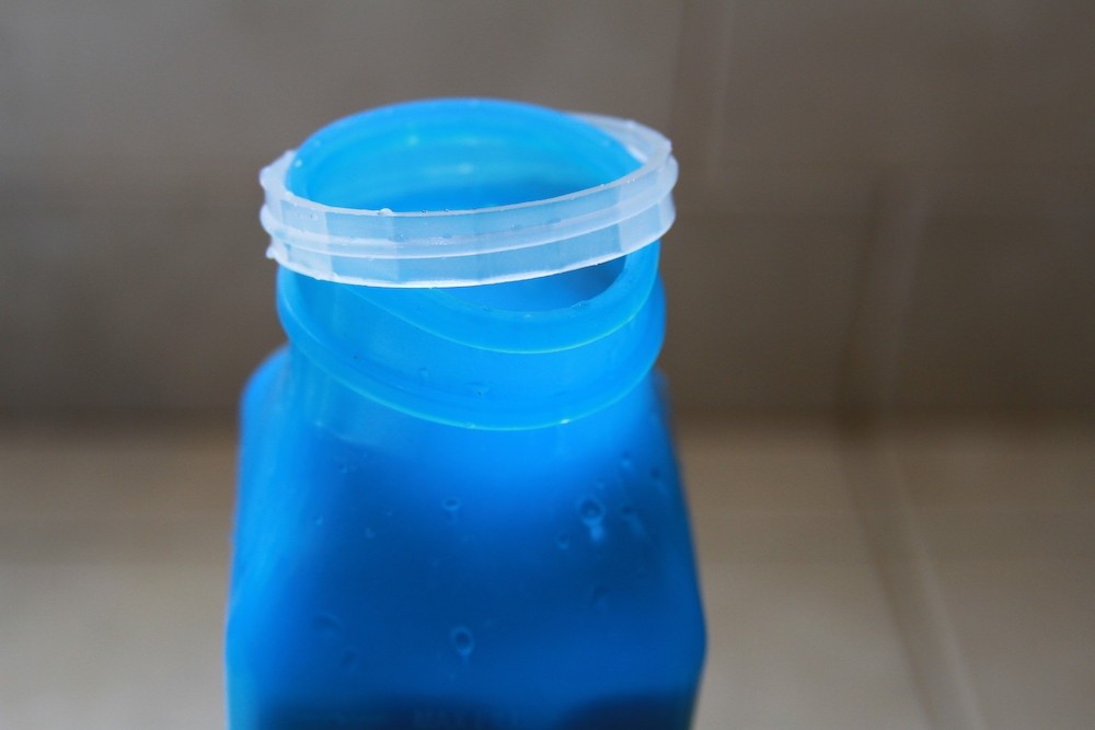 Once it's filled, place the plastic collar and filter back on and inside the neck of the bottle. Then affix the secondary filtration system on top. In general, we could this to be annoying as the bottle bends under the force of twisting on the filter, but we got the hang of it after a while.