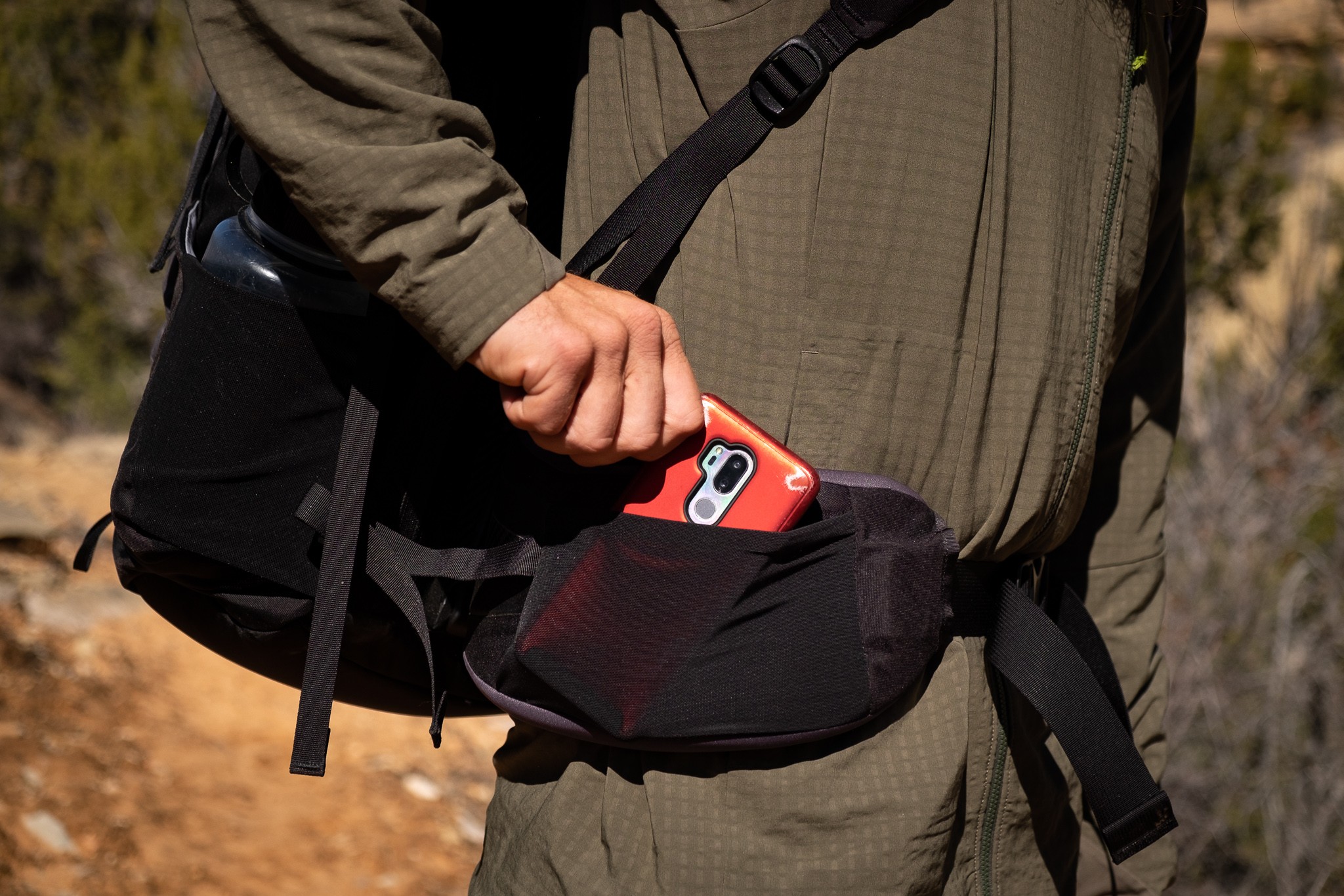 The waist belt features two stretchy mesh pockets. Unlike all the other models we tested, these pockets aren't zippered but instead are made with a stretchy mesh tight up against the waistbelt. They are tight enough to ensure that anything inside will stay put and not fall out. They are perfect for small snacks or an average-sized point-and-shoot camera, but the standard zippered hip belt pockets found on other packs tend to be larger, more versatile, and more user friendly. There is also a side-access zipper on one side of the pack. While this zippered access point isn't huge, it is more than appropriate for the volume of this pack.