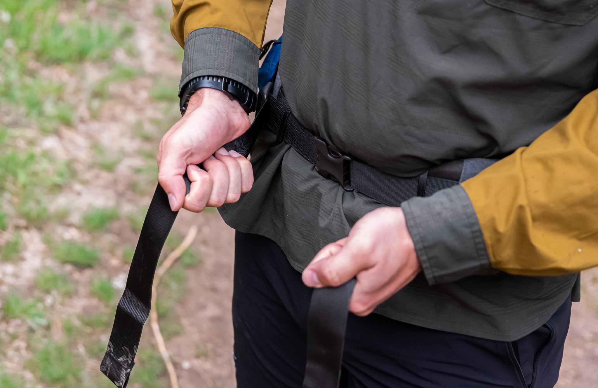 The torso length adjuster is a slide lock and webbing that can be tightened or loosened to match your height. We measured its vertically adjustable range at 4 inches.