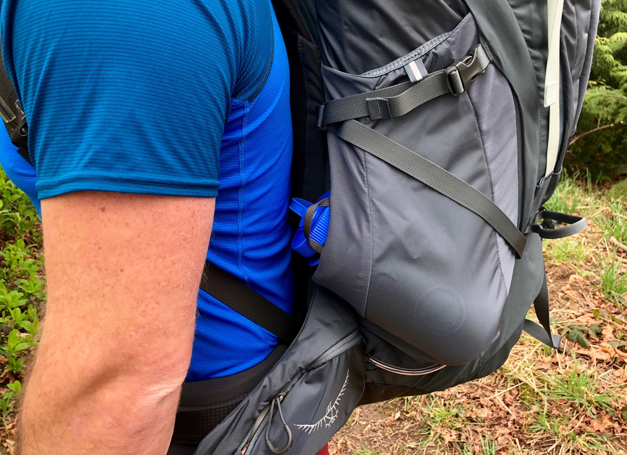 This pack also has dual-orientation water bottle pockets: a traditional and secure vertical orientation as well as a diagonal forward-facing opening to make it (relatively) easy to remove and re-stow a bottle on your own. These stretchy water bottle pockets are also large enough to fit tent poles or similar items securely into the pocket on the side of your pack even if you have a water bottle in there.