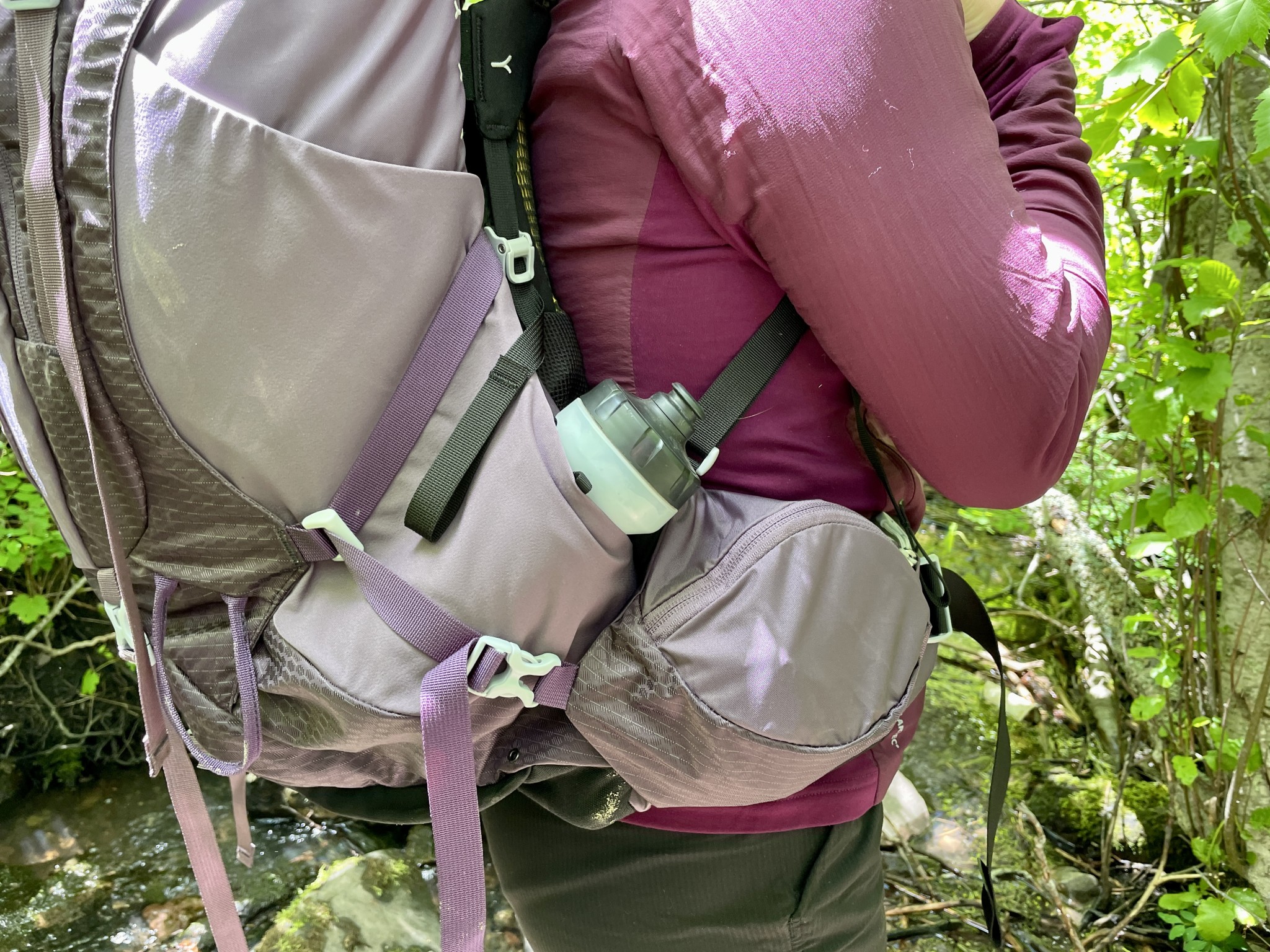 The hip belt pockets are huge. A smartphone easily fits along with snacks and lip balm. The side water bottle pockets fit tall, narrow bottles well, while a wider, Nalgene-type bottle fits snugly. It is easy to access bottles with vertical and horizontal entrances. While in the horizontal position, the taller bottles get in the way of your elbows, while wide, short bottles are hard to get in and out.