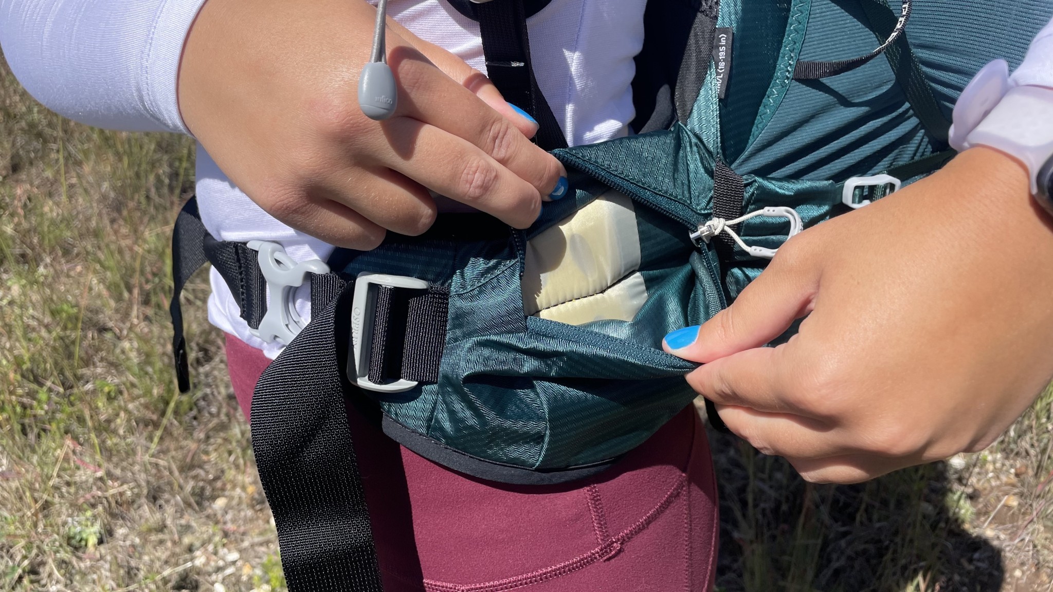 The exterior pocket has a clip closure and plenty of flexibility for stuffing layers, river shoes, and other items you may want easy access to. The bilateral mesh side pockets are large enough to accommodate large water bottles, easily swallowing up our standard 1-liter Nalgenes, but are not particularly accessible when the external compression system is at work. The zipper pulls on the hip belt pockets are easy to grab and use without a lot of fuss, but we do wish that the hip belt pockets were a bit more robust. The external compression straps adhere to the lateral edges of the hip belt pockets, which creates a bit of additional airflow while also ensuring that the entire pack moves with your body instead of independently.