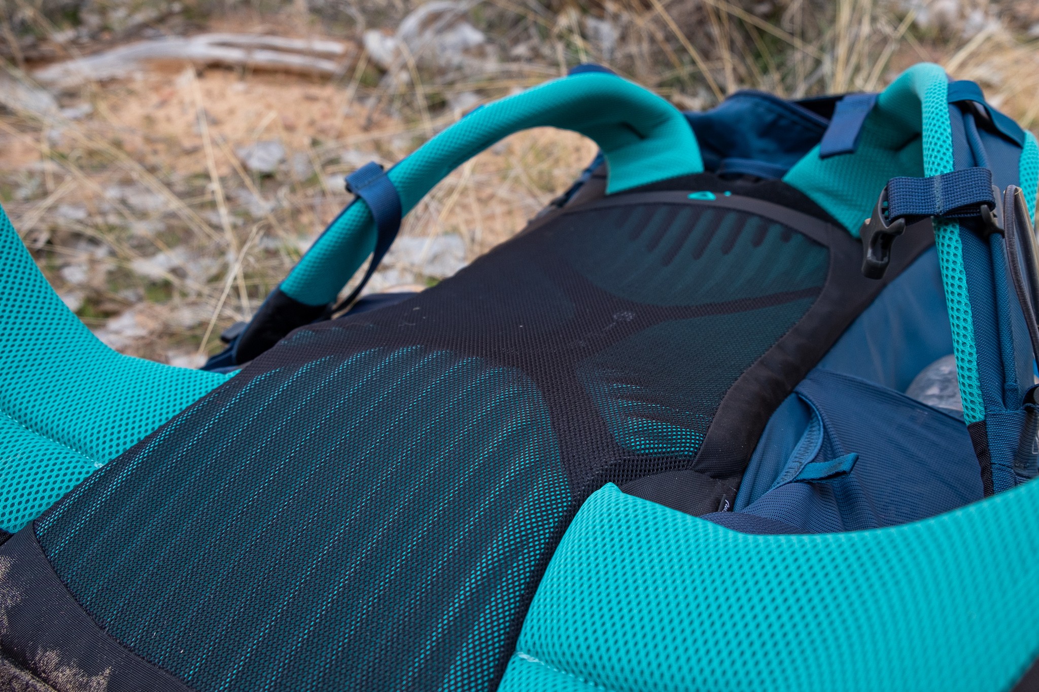 The Kyte's suspension, while very comfortable with moderate loads, can buckle in the back padding when loaded with more than 25 pounds. We still found it comfortable, but it is worth noting that it may bother some users' backs. Osprey doesn't use their trampoline style suspension on the Kyte but opts for the more traditional back panel that fits closely to your back. We found it very comfortable but it doesn't offer the breathability you might want in hot weather.