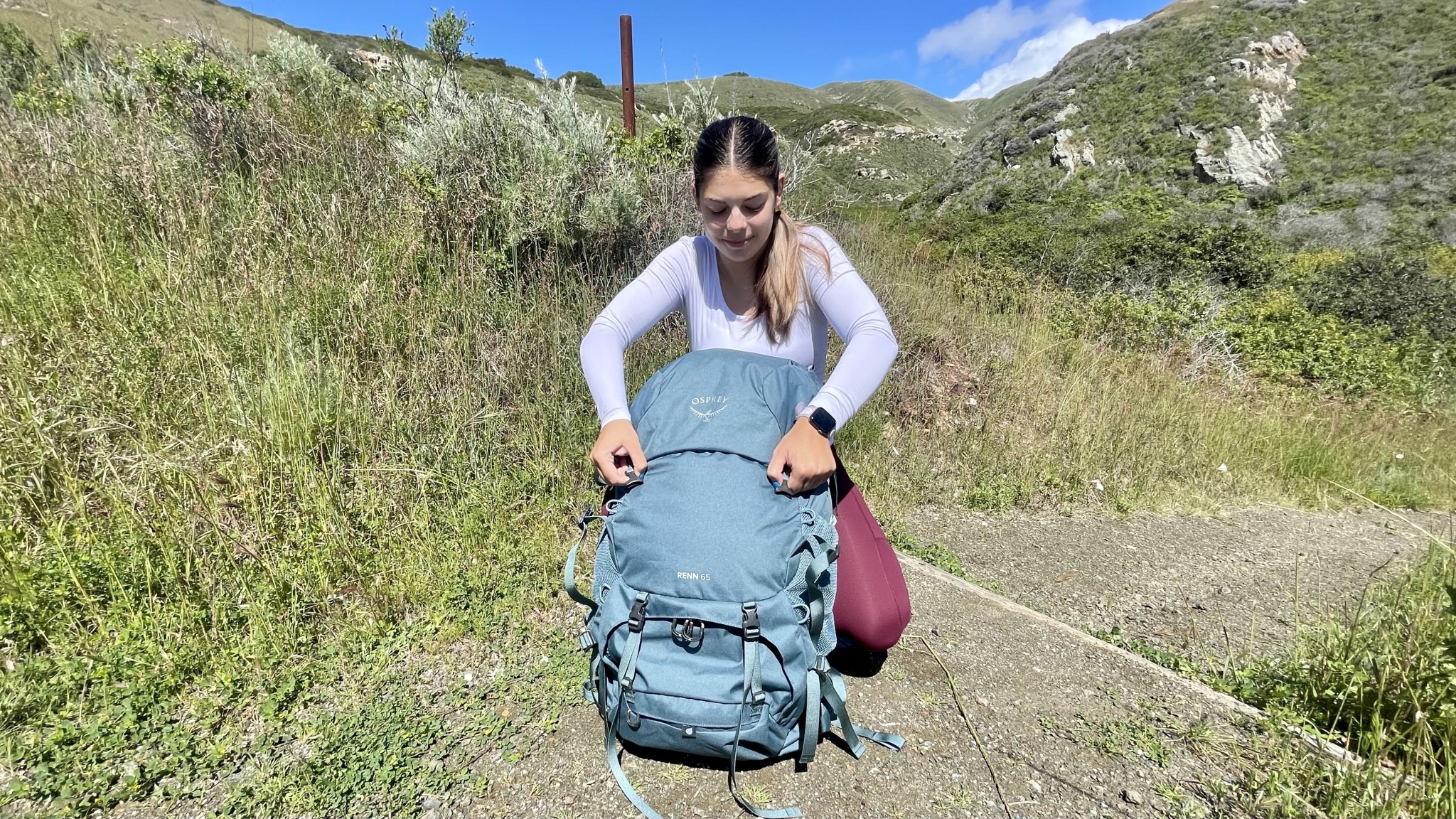 Gone are the days of hoping you adjusted your pack correctly at home while it was empty. Osprey incorporated an easy-to-use system with five set adjustment points. To adjust the height, you simply remove the bilateral clips from their security points and slide the shoulder padding up or down. This is an easy adjustment to make on the trails, providing an element of versatility and surefire comfort to the Renn. Unlike many of the higher-priced models we tested, the hip belt has no adjustability beyond tightening the webbing itself. While the range allows users between 26 and 48 inches to fit in the hip belt, the padding will end up behind the iliac crest for women with larger hips. As previously mentioned, the weight distribution allows this to be fairly comfortable, but we understand that curvier women might prefer a pack with adjustable hip padding.