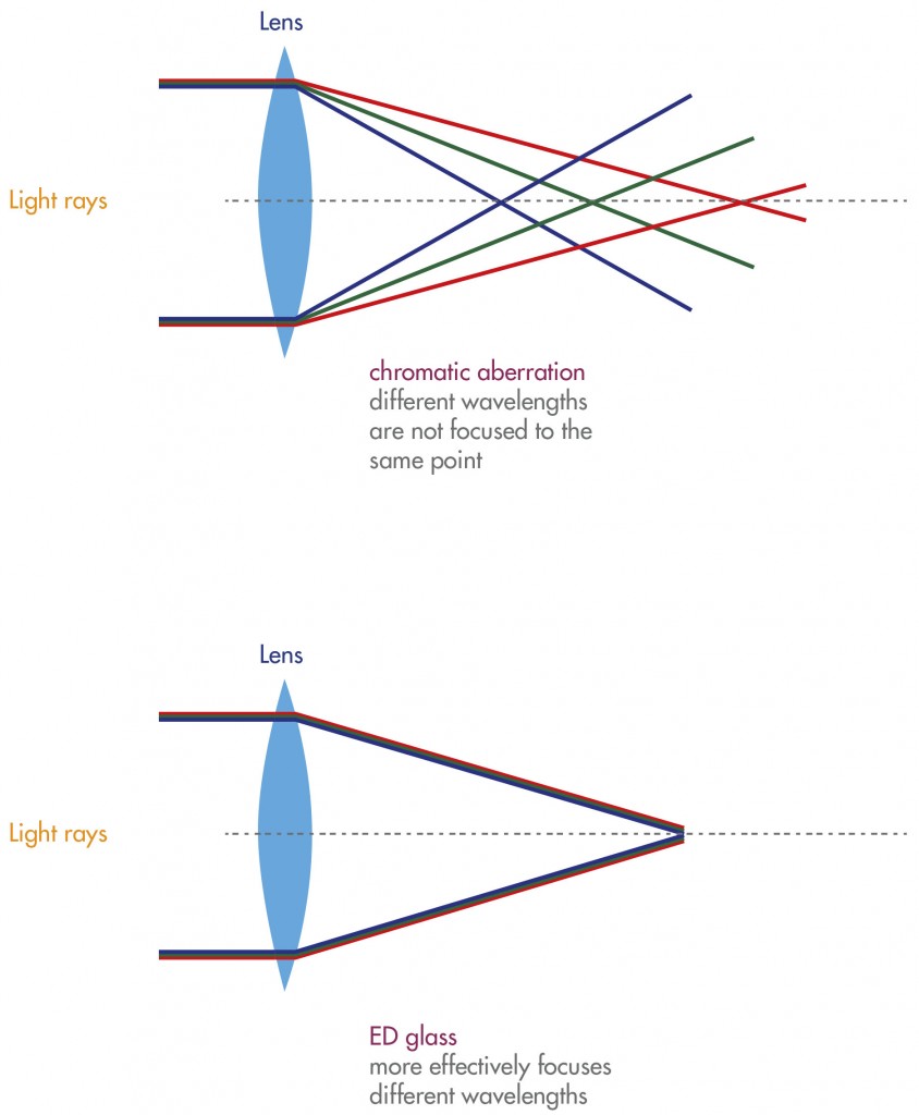 The light hits the objective lens of binoculars, the wavelengths refract in a way that disperses color when your eye processes the image. This causes images you are viewing to be become blurry or for the colors of the image to run. Often this presents itself as a purple fuzziness to the outline of the object you are looking at. To prevent this, Nikon has designed an objective lens that differs from the traditional lens size and comoposition, called extra-low dispersion glass, which compensates for chromatic aberration and reduces the fuzziness of colors when viewing your image through the Monarch 7 lens. ED glass is also used in the top-socring Swarovski EL 8.5x42 and the Vanguard Endeavor ED.