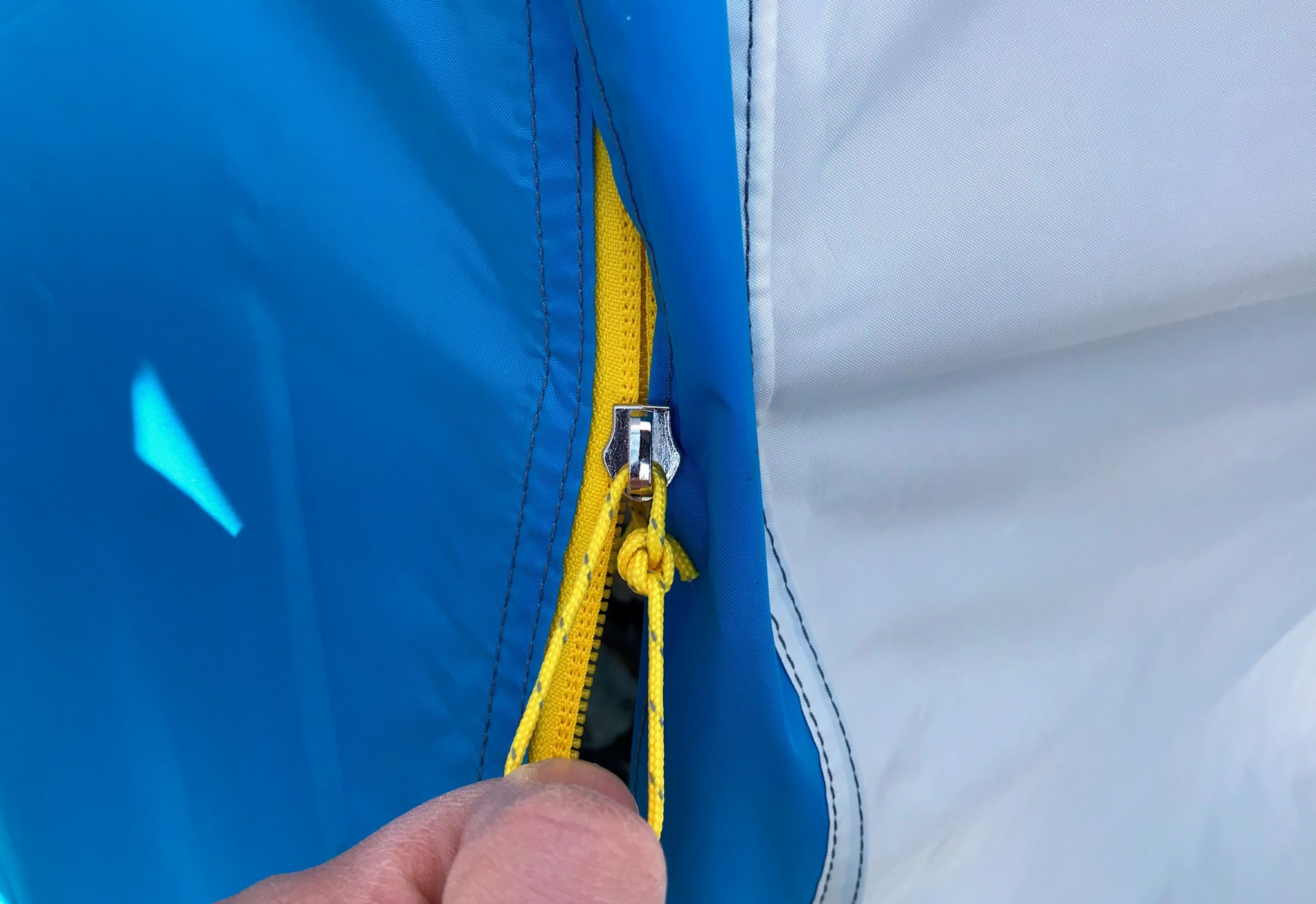 This tent is easy to pitch, but it is not freestanding. Two poles horseshoe around the head and the foot to create the structure, and the corner stakes provide the tension to volume it out. The fly and tent have a color-coded corner, so you know everything is oriented correctly, and then the fly clips into place. There are a variety of points to stake out the tent. The bummer is that between the four corners of the tent and the seven stake points in the fly, we were left a couple short with the nine stakes that the tent came with.