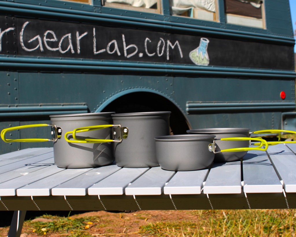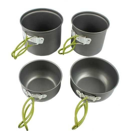 The G4Free Outdoor Camping Set is a four piece set cast of aluminum and weighs in at only 1.2 pounds, or about 19 ounces. It comes with two pots and two bowls that double as lids that are ideal for the backpacking scene. It has folding handles that wrap around the cookware instead of flipping over the system, and compacts to a packed size of 5.5 inches in diameter by 6.6 inches tall that all fit neatly into a mesh carrying bag. Each of the four pieces can be pared down to the smaller pot with a lid or the more significant pot with lid, and the set can comfortably fit an entire cooking system within it.