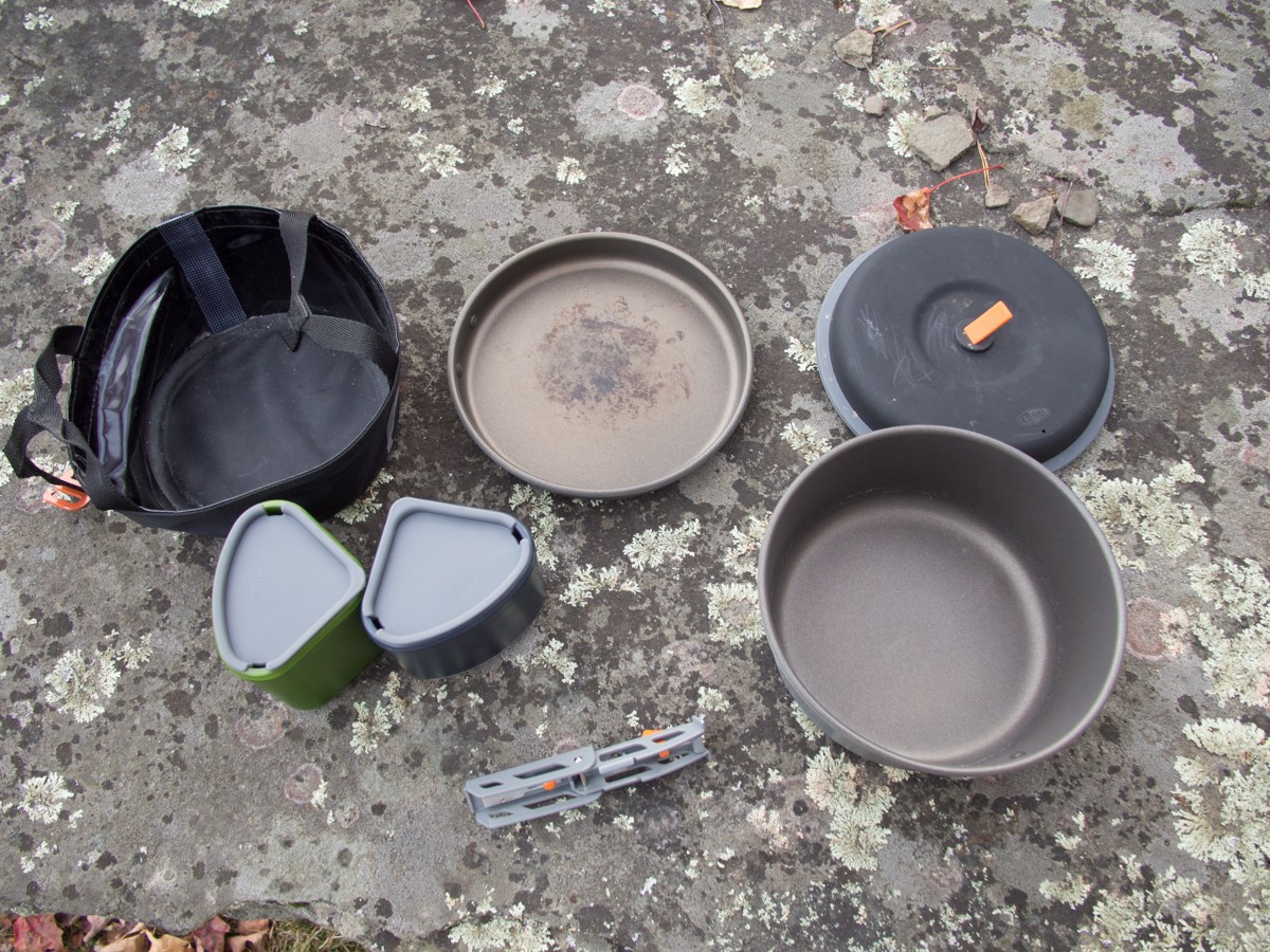 There are two major types of cook sets we tested. There are those sets that are the pot or pots that will form the foundation of your cooking and eating system, and there are the sets that at least attempt to be comprehensive in their feature set. Regardless of how you acquire your cooking and eating supplies, it seems that most want pot, pan, cup, bowl/deep plate, fork, spoon, knife, and cutting board. No one set in our review includes all of these things, but some come close. The Pinnacle Backpacker outfits a team of two with pot, pan, bowl, and cup. It also includes an innovative fabric “wash basin” that can also serve as an extra water reservoir.