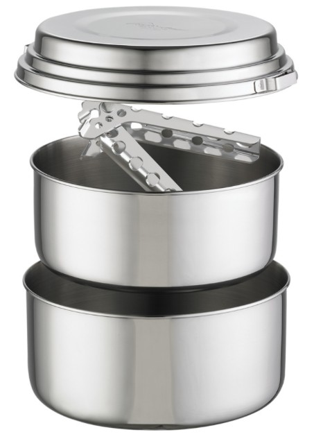 The MSR Alpine 2 Pot Set is one of the stainless steel cookware sets in our fleet. The set as a whole weighs just a bit over a pound and measures eight inches by a little over four inches when packed together. It includes a 1.5 and 2 liter pot, a lid that may also double as a plate, a pot grabber, and it neatly packs into its bag. There are other products far better suited to elaborate cooking, but there is nothing that will last longer.
