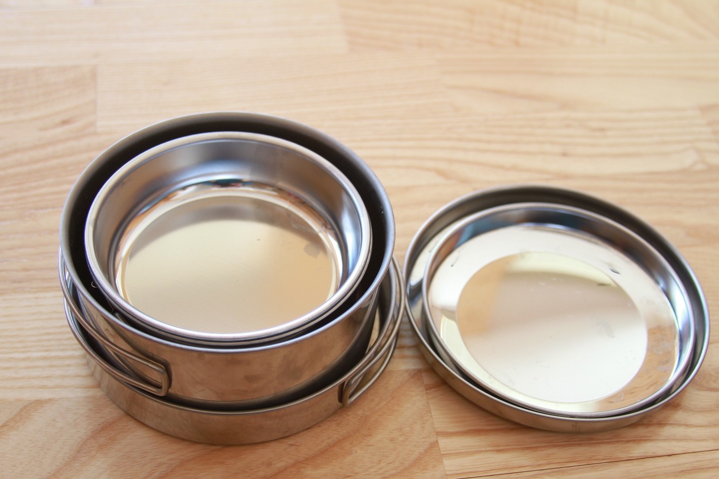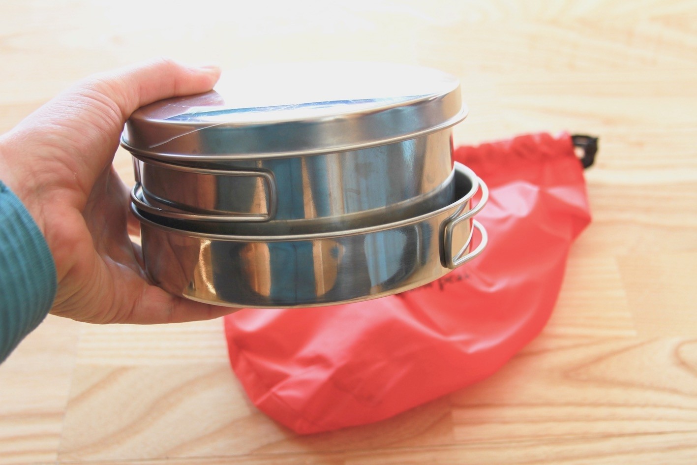 This is a small cook set taking up very little room in your pack. The two pots and pan all nest together with a small plate and carry sack to keep everything together. For solo backpacking trips, we typically only took the larger pot and pan, and put our stove inside. Instead of using the super tiny provided plate, we just used the lids and the pots themselves for eating the foods we brought.