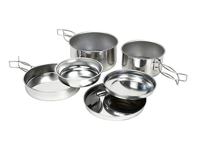 Standard and simple, this set comes only with one larger pot and a smaller pot. It has a foldable pan that nests at the bottom, with a tiny plate that's a bit on the small side. The pot lids are simple in design and don't have a gusseted fit to keep heat inside the pot. This set has everything you need, but it's far from a full kitchen. It's best for the minimalist backpacker looking for a camp set that'll suffice for just him or her.