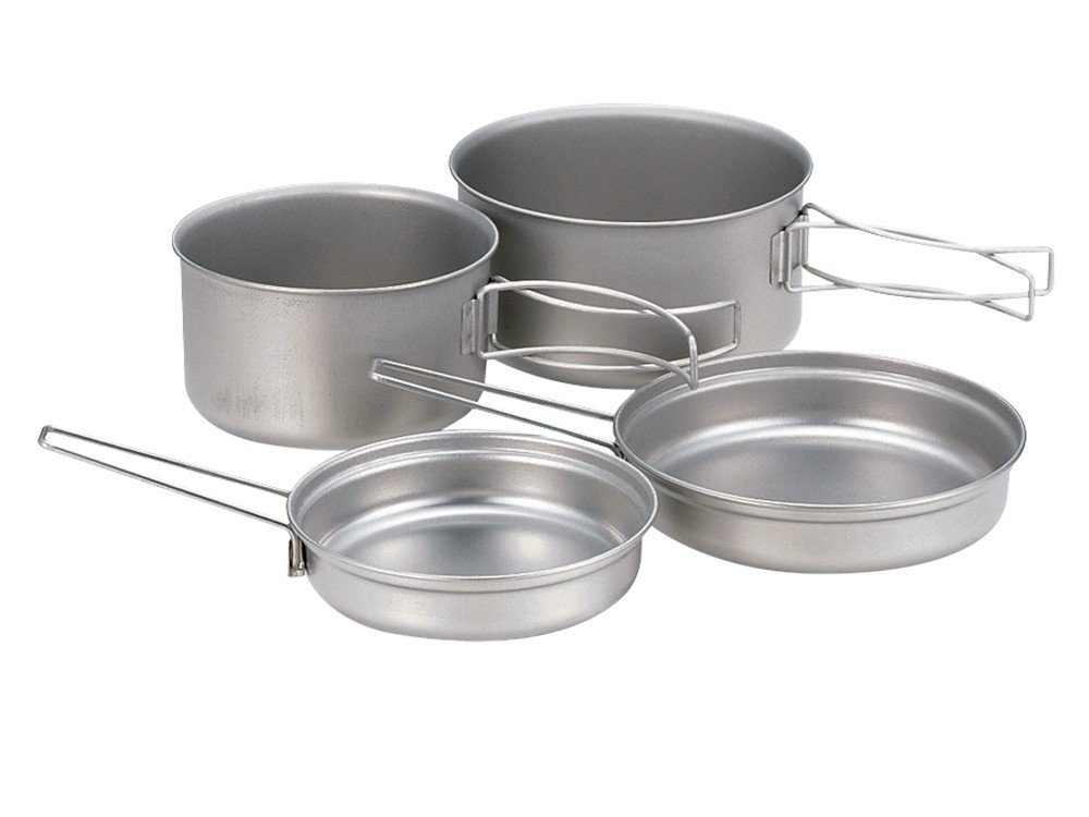 The Snow Peak Titanium Multi Compact cook set is a four-piece set that is designed for ultralight backpackers on the go. Cast from super-light titanium, this set comes with a 1-liter pot, a .8 liter pot, a 6" lid/frypan, and a 5.3" lid/frypan. These pieces come in a mesh bag, and can also be purchased as a three-piece set that comes without the smaller lid. For ultralight backpacking, lightening your kitchen kit makes a big difference.