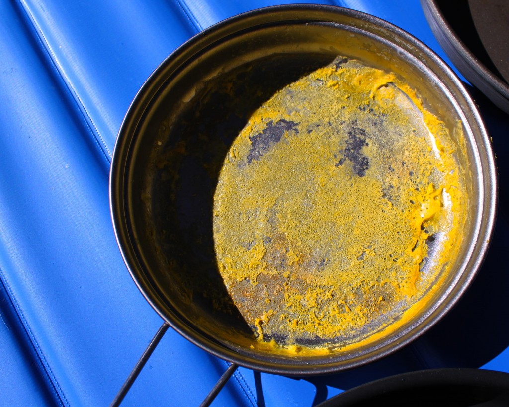 When it comes to backpacking specific cookware, they're rarely made with cooking fresh ingredients in mind, instead focusing on lightweight materials that tend to conduct heat poorly. Unfortunately, this set performs horribly when it comes to our scrambled egg test, which is a function of the materials used. First, the titanium is a poor conductor and doesn't distribute heat well. Since the metal doesn't conduct and distribute the focused heat of a camping stove, the eggs in our standardized test cooked unevenly with a difficult cleanup. Second, it doesn't have a non-stick coating.
