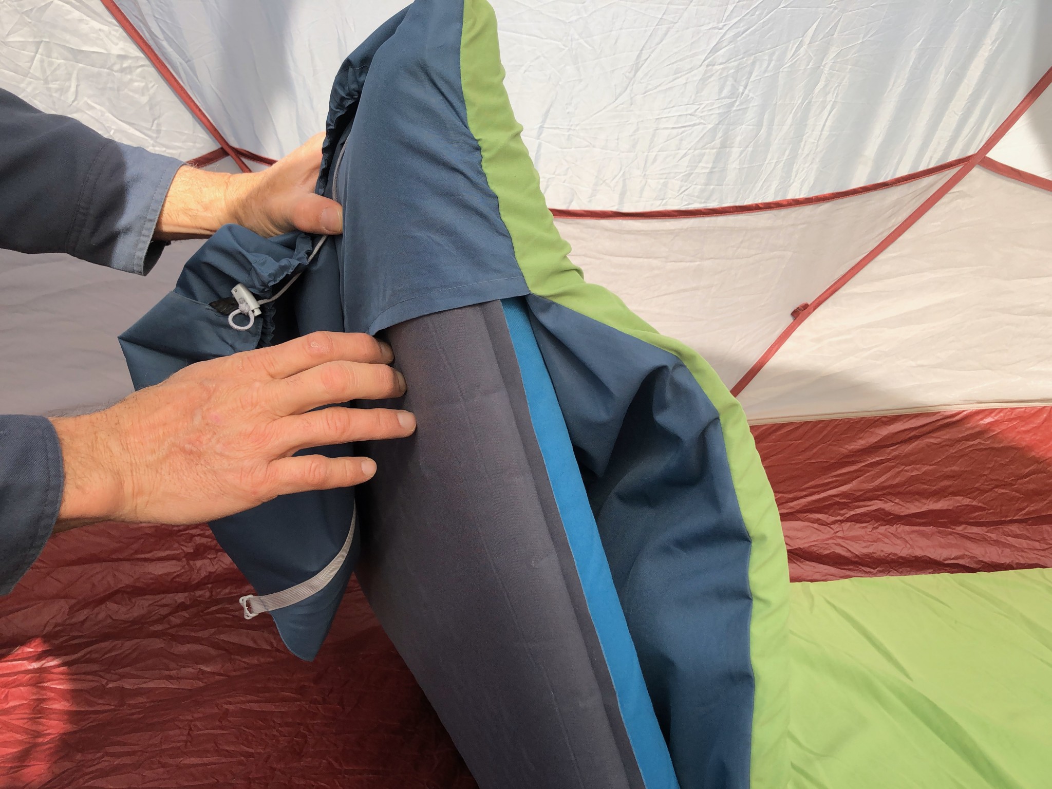 There is no doubt that the Sleeping Giant is simple and easy to use, but it certainly takes more work than other mattresses, mostly because you need to set up both parts of the system. Once your sleeping pad is inflated, you are intended to slide it into the envelope that holds the memory foam. We found this to be kind of a pain and not worth the effort. There is a flap at the top of the Sleeping Giant that can slide over the top edge of the sleeping pad, and we found this to stay in place perfectly adequately.