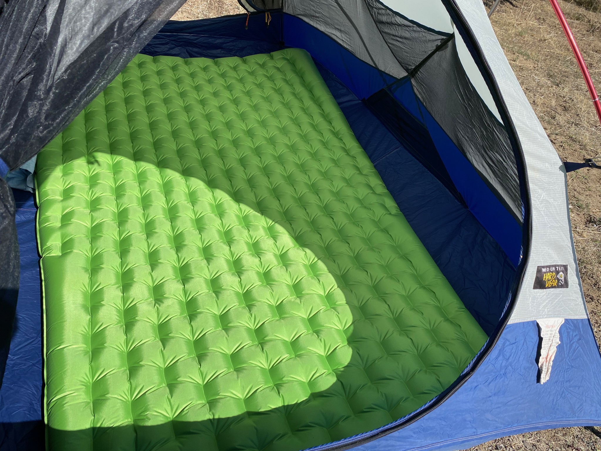 With an R-value of 3.2, this mattress is not intended for cold nights. We could see the Primaloft Silver insulation inside the air chambers, and it works well to reflect body heat in warmer weather. Once the temperature dropped below 40 degrees, however, we were not warm. Additionally, the cold air caused the pressure in the mattress to decrease, allowing us to feel the ground below. This was remedied by adding air in the middle of the night, but it didn't allow for uninterrupted sleep.