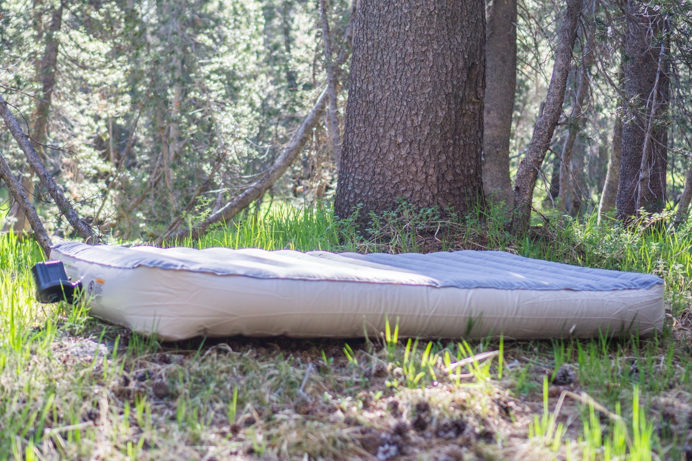 This is one of the most convenient mattresses we tested. Attach the fully charged pump to the valve, and the pad inflates in about three minutes. To deflate, push in a tab on the one-way valve, attach the pump on the side labeled “deflate”, and the pump will suck out all the air, leaving you with a mat that's easy to roll up and pack away. The pump comes with a wall charger and a car charger, so yes, you do need to plan far enough ahead, so the pump is charged, but the car charger allows you to procrastinate, or be impromptu about your camping plans a bit more easily. We found one charge is just barely enough to inflate and deflate the mattress twice.