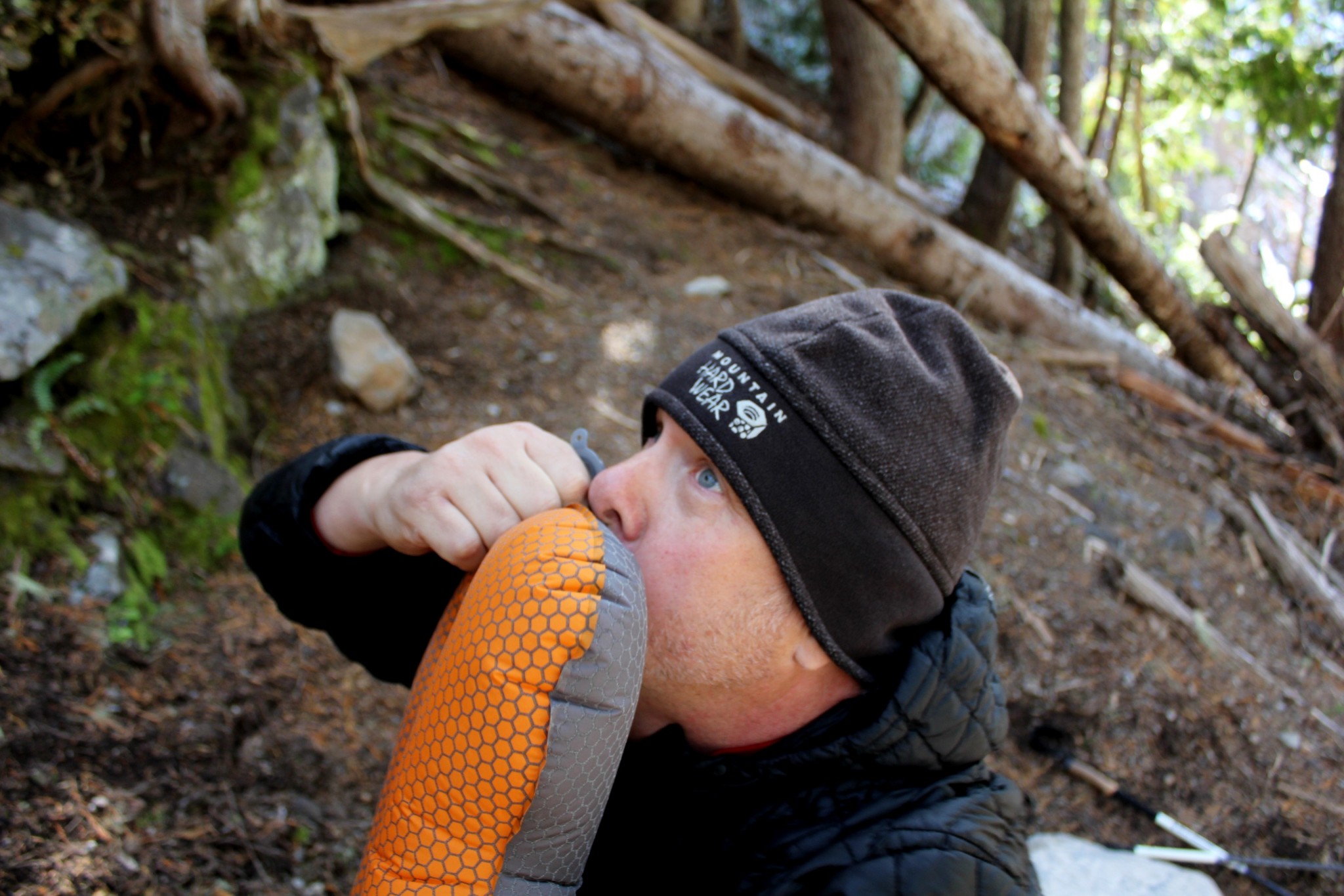 The AirPillow UL uses a large flat valve for inflation and deflation. The value has a built-in rubber valve that opens a when you blow into it and seals off the opening in between breaths to prevent air leakage. We found this system very effective and easy to use, allowing us to fill the pillow in just three breaths or less completely. Normally, the polyester fabric that the AirPillow UL is made from tends to slide on the silky fabric of most mummy bags easily. However, we feel this pillow tends to stay in place a little better than most with the help of a micro-thin, honey-comb shaped coating called GripSkin. It fits well inside the hood of a mummy sleeping bag, deflates and packs up very easily, and can be hand-washed. We didn't like that the fabric tends to absorb water instead of being water-resistant. It's also a bit crinkly and tends to create and amplify noise from movement during the night.