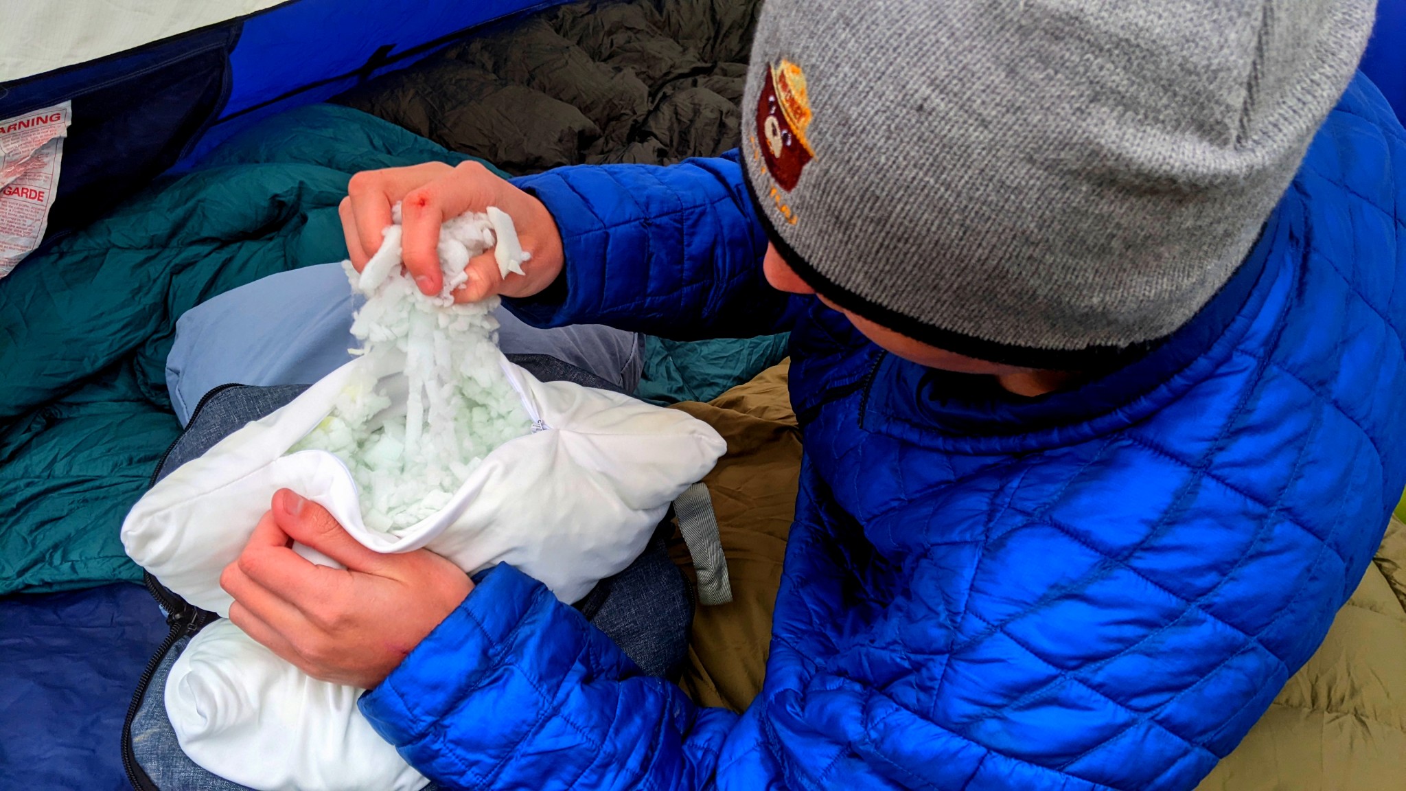 The Hest Pillow does not stuff neatly into a small, apple-sized stuff sack. In fact, we've tested entire sleeping bags that pack up smaller than this pillow. When fully stowed, the Hest condenses down to just under half its size (think medium-sized watermelon). Comparatively, its 11.4-liter packed size is 5 to 10 times larger than any camping pillow we've ever seen, earning it our lowest score in this metric.