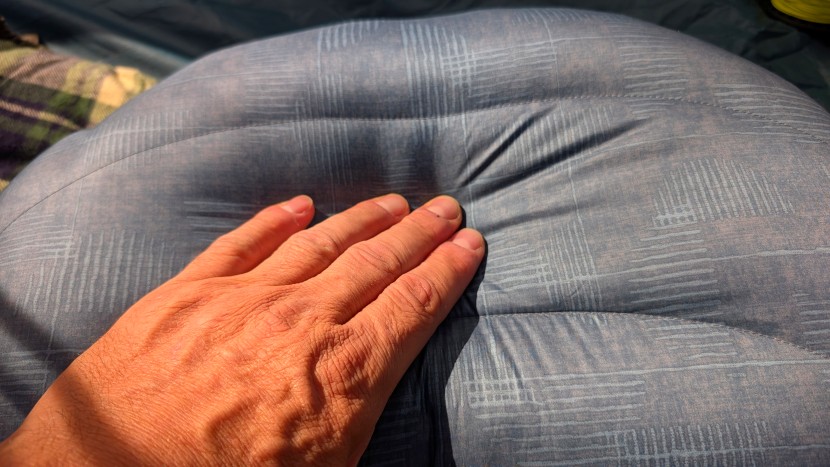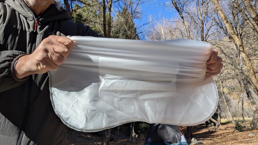 While the polyester quilted top of the Therm-a-Rest is soft and silky, the bottom fabric is not as smooth—and this is a good thing. The underneath is covered in a micro-fleece type material that is soft but grabby. The reason we liked this is that it keeps the pillow in place while tossing and turning. Many inflatables tend to slip and slide against the fabric of sleeping bags and pads. Not so with the Therm-a-Rest. It stays put well, so you can call off the midnight pillow search party.
