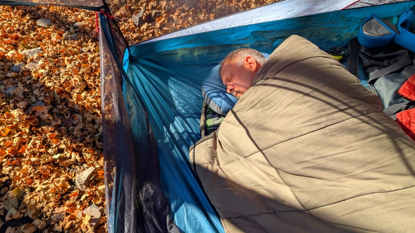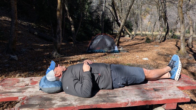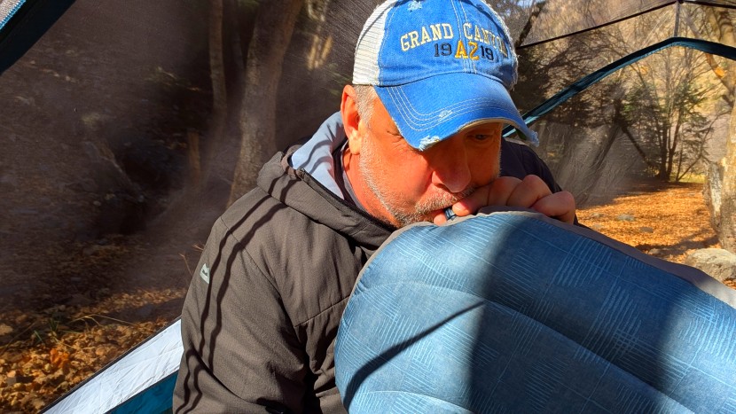 It doesn't weigh much, feels like a down puffy, and it's notched so it rides nicely on the shoulder—these are the three features that really make the Air Head Down a legit option for both car camping or longer trips into the backcountry.