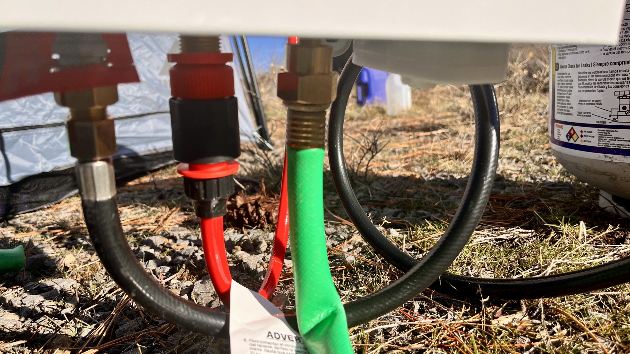 Beyond the considerations of your water input, this model also requires a propane tank to heat the water and two D batteries to ignite the propane every time you turn it on. The warmer your shower, the faster it burns through propane. And while the unit itself is technically portable, it requires a stable mounting surface—either through screws on the shower's body or a hangar on a flat surface that hooks securely to the metal handle on the top. The Camplux Pro comes with a propane line (regulator included), though it's just 5 feet long, meaning your propane tank has to remain very close to wherever you're showering.