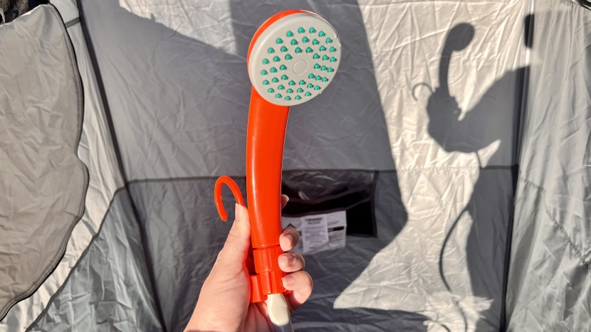 And this shower doesn't do anything to the temperature of the water in your preferred receptacle. On the one hand, it's fairly easy to boil a few kettles of hot water in the campground to add to cold water, creating a pleasant temperature. On the other hand, if you don't have a method to heat water, you'll be stuck with whatever temperature you've got.