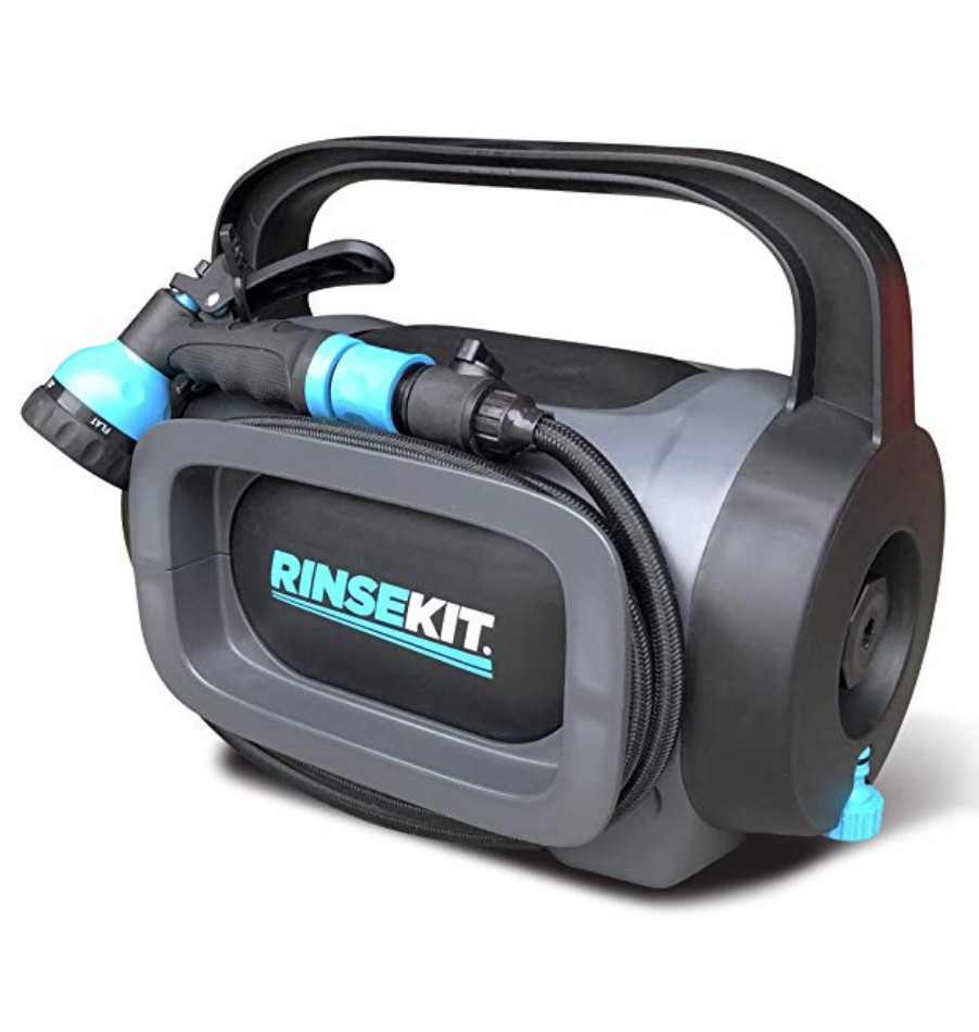 The RinseKit POD is a battery-free, portable, pressurized shower with a garden hose-like nozzle. It holds 1.75 gallons and has a 6-foot hose with a 1.6-inch wide shower spray.