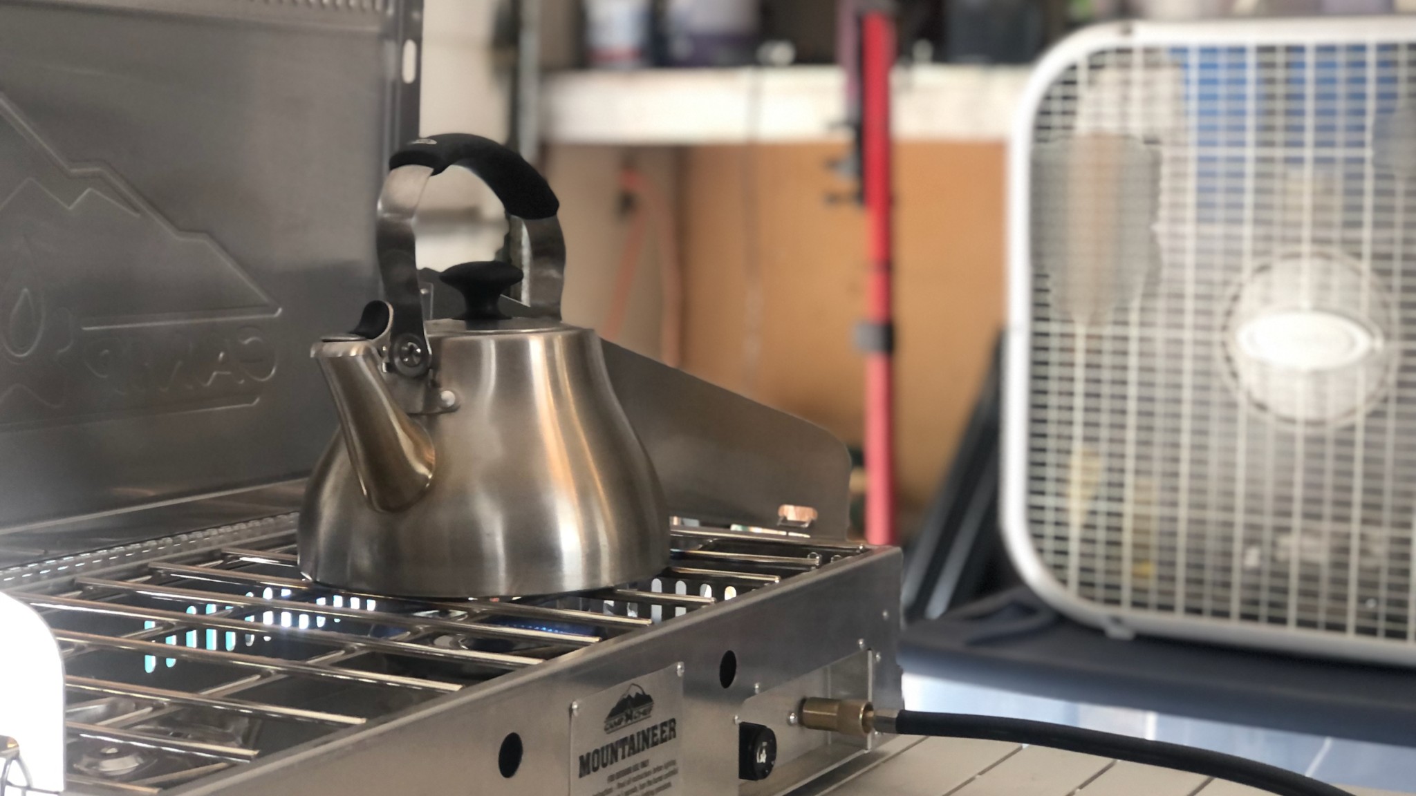 We conduct the boil tests in our garage “lab” at 5,000 feet above sea level. For the “windy” test, we situate the stove adjacent to a box fan and use a pocket anemometer to ensure a constant “wind” of 2-4 mph. In the windy test, it took the Mountaineer 4 minutes and 46 seconds to boil 1 liter of water and 4 minutes 4 seconds in the windless test. This means it only took 40 seconds longer to boil water with wind than without. This excellent performance is owed, in part, to having high-powered burners and top-notch design elements. The windscreen creates a tight seal, and the burners are recessed deep in the stove body. These two design features effectively shield the burners from wind coming from almost any direction. Beyond that, the Mountaineer boasts two 20,000 BTU burners.