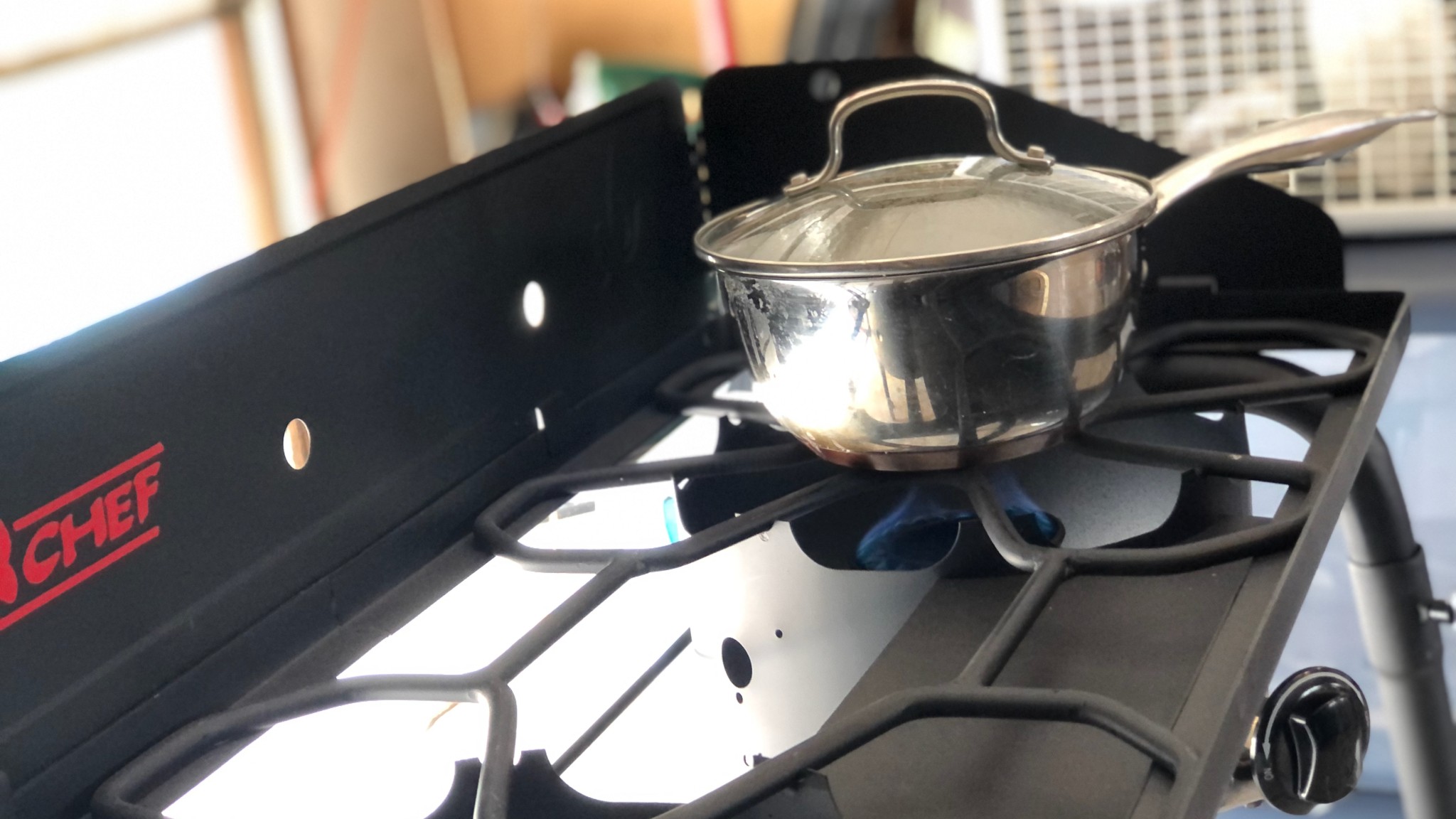 To assess boil time and wind resistance in a controlled manner, we placed each stove next to 2-4 mph of constant wind produced by a box fan on low. We then measured how long it took to boil water in the presence of this “wind.” The Outdoorsman was completely unphased by our box fan, boiling 1 liter of water in 2 minutes and 34 seconds. In our wind-less test, it boiled 1 liter of 58°F water in an impressive 2 minutes and 30 seconds. That is a difference of only 4 seconds! Even without a drip pan to protect the burners, this stove is so powerful as to be unaffected by our wind test. With two 60,000 BTU burners, the Outdoorsman has at least double the power of any other stove in our review. In truth, it has more than double the power of most burners in commercial kitchens, let alone your home range. This undoubtedly contributes to it having an unsurpassably quick boil time with or without wind.