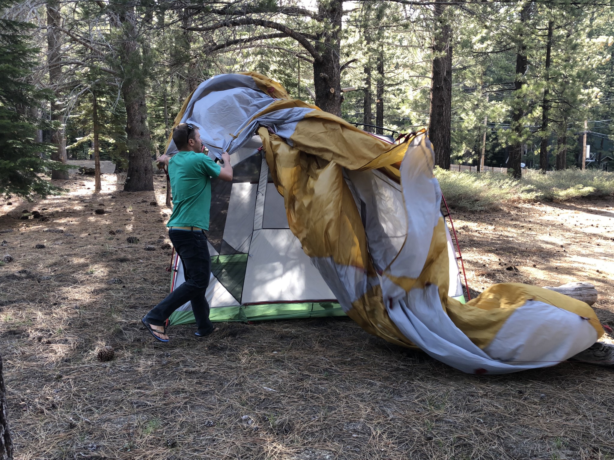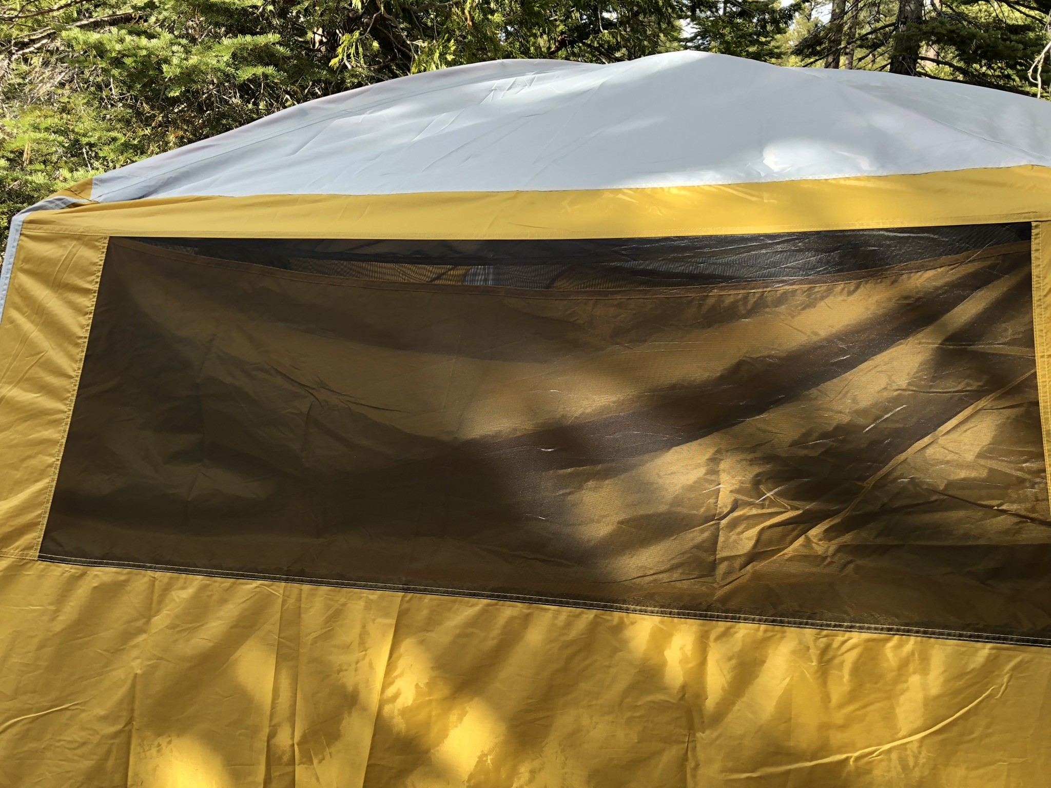 The drawback is that you have to remove the rain fly to expose the mesh, which doesn't seem like a massive problem until you realize that the rain fly is also the structure of your gear garage. No rain fly, no gear garage. Adding to this conundrum is the fact that the size of the rain fly has been officially termed “enormous.” NASA may very well be able to see this rain fly from space. Taking that rain fly off and putting it back on again (don't forget about the staking and guy-lining of the gear garage) is not a quick task.