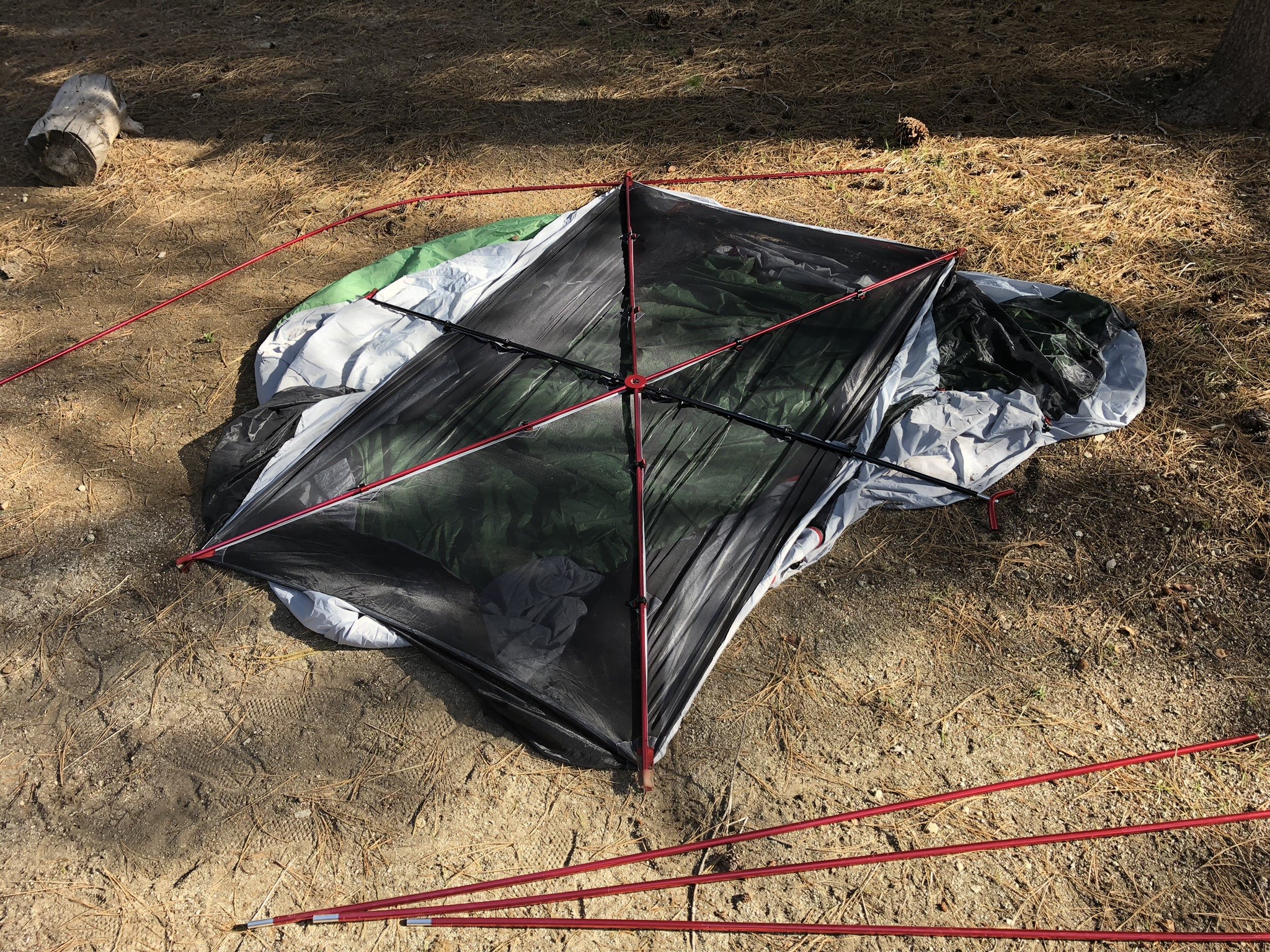 Two crisscrossed poles stretch the length of the roof. The difference with the Boondocker is that they only go the length of the roof, whereas many other tents (the Wawona and the Limestone for example) take these same poles all the way to the ground. Interspersed with the first two poles is a six-pronged hub that sits in the middle of the roof and sends four poles out to the corners of the tent, and another two, shorter, tensioning poles.