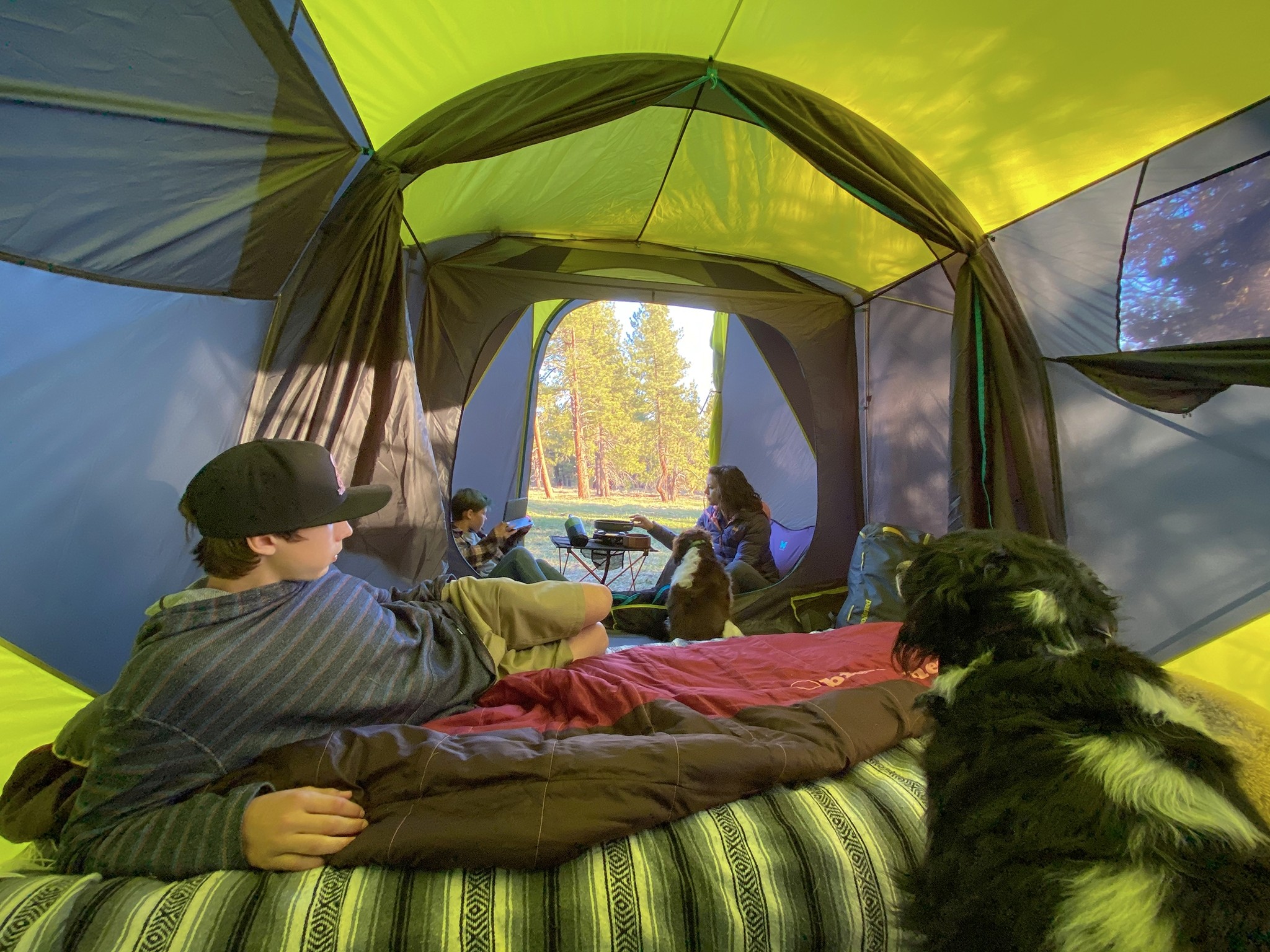This is the biggest, tallest tent in our lineup. When it comes to square footage space, this tent has 125 sq ft covered. However, when it comes to usable space, things get smaller. The main tent has a separator that splits the room in two — a great feature in theory.