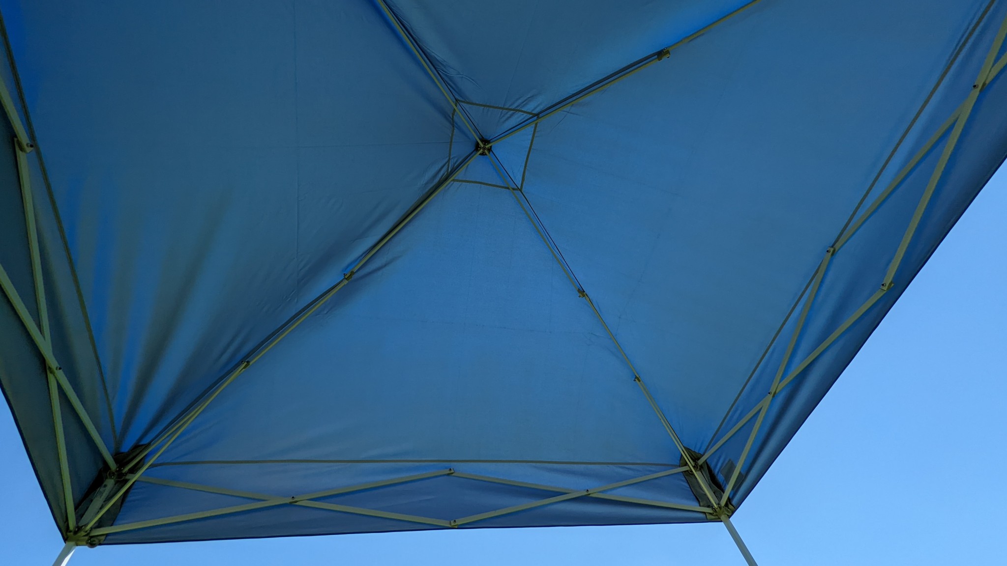 Sun is no match for the E-Z Up. Its thick polyester fabric effectively blocks rays, resulting in very little residual glare into the eyes. Additionally, the underside of the canopy is reflective, which helps keep the canopy slightly cooler. The fabric effectively blocks UV rays, and the manufacturer states that it meets CPAI-84 and NFPA-701 fire-resistant requirements.