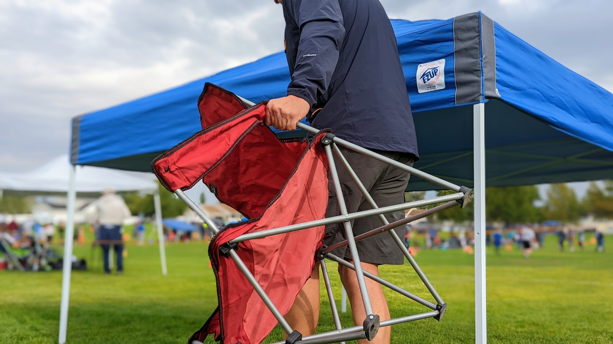 We found the E-Z Up very functional and awarded it accordingly for this metric. Weighing in at about 54 pounds, it's a little lighter than canopies of similar quality, so it's a bit easier to set up and maneuver. Its stand-out feature is the proprietary Wide-Trax Roller Bag which dons two large, wide-set wheels. The wheels are the largest we've seen, allowing the EZ Up to plow through uneven terrain. Although large, we found this canopy very easy to transport from car to sideline. We feel the roller bag is the EZ Up's greatest feature and, therefore, a key component to its day-to-day functionality.