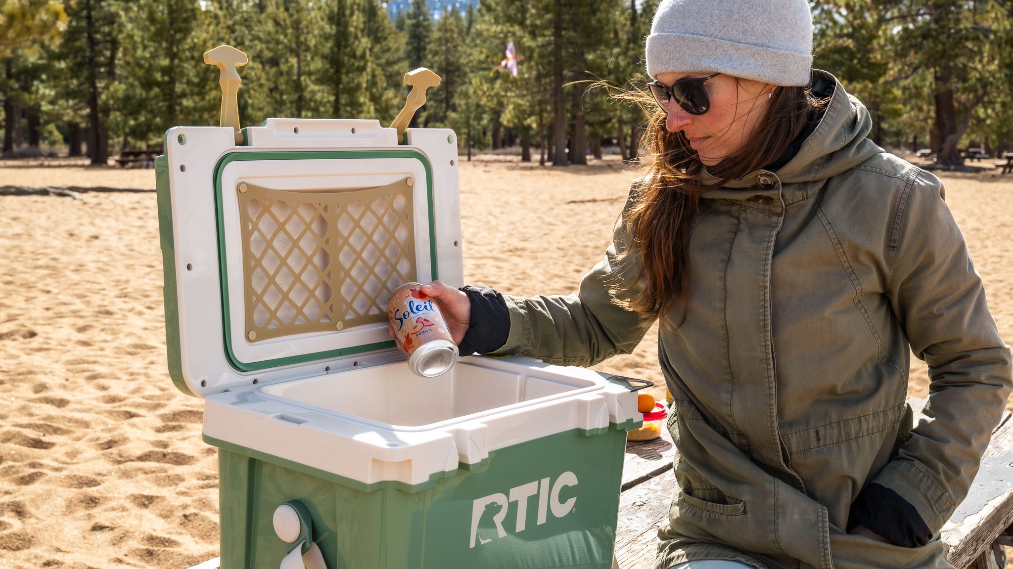 The RTIC 22 is quite secure once closed, featuring a freezer-style gasket to lock in the cold and moisture. It didn't leak at all during our water slosh test while walking with it, nor when we bounced it around or tilted it at an angle. The only time we noticed a tiny leak coming from the RTIC Ultra-Light was when holding it at a steep angle while walking — and that was negligible. Our lead tester, Gena Bradshaw, calls out its strength, saying, “Even though this is a very small cooler, I was able to stand on it and it remained stable.” The top of the lid is also textured with a nonslippery plastic; this helps provide an added degree of stabilization when standing on it.