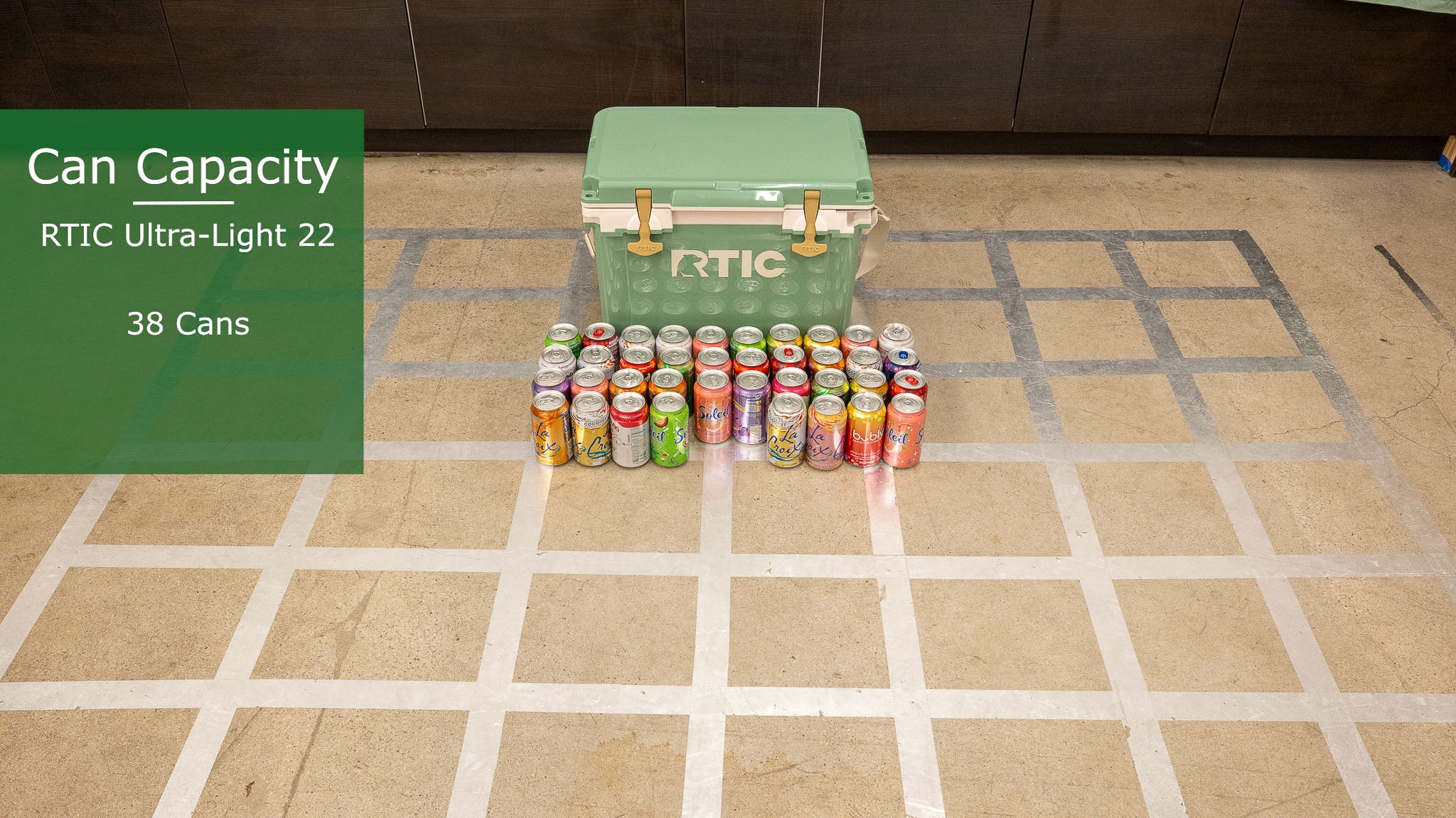 Although the RTIC Ultra-Light 22 doesn't have any handles molded into the cooler's body, there is enough of a lip on it to grab onto if necessary. We like the 2-in-1 carrying strap, which is made of a durable webbing material and features a neoprene handle for comfort. The strap is fully adjustable and can be shortened into a handle. RTIC claims the capacity of the Ultra-Light 22 can fit 30 cans. We had success fitting 38 12-ounce cans total, though this required a bit of Tetris. Its internal height of 12.5 inches can also accommodate a bottle of wine upright inside. It can fit up to eight wine bottles, making this cooler the life of the party. A nifty silicone net pocket on the lid's backside is great for small items. When the weekend is over and it's time to store the Ultra-Light 22, it keeps things simple with a convenient rectangular shape and small storage footprint.