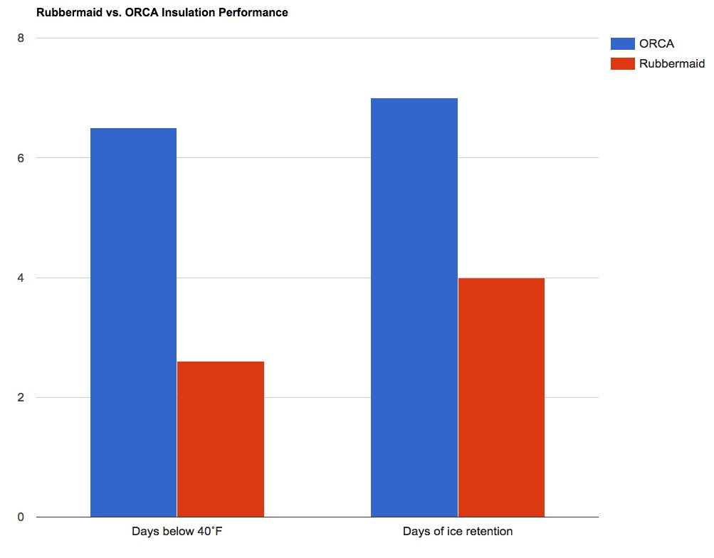 The DuraChill was the worst performer in our insulation tests, earning a score of 2, and did not live up to it titular 5-day claim. It was able to maintain safe food storage temperatures for 2 full days and ran out of ice after 4 days. It should also be noted that it briefly reached temperatures above 40˚F in the middle of day 2, but for less than an hour, which is inside the time limit for safe food storage set by the FDA. This result makes the Rubbermaid the only model we tested that would not last through a long weekend camping trip. Considering this poor performance and the fact that it includes built-in wheels, the DuraChill is better suited for rolling a bunch of cans to the end of the dock for sunset drinks rather than storing food on any extended adventures.