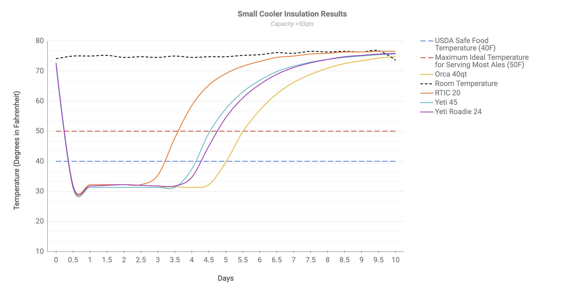 Providing 98 hours of sub 40°F temperatures during our insulation testing, the Tundra 45 does just about average when compared to the others its size. If your concern is less about fresh food and more about cool drinks, this mid-sized model went on to maintain internal temperatures of 50°F for 108 hours locked inside our hot testing room. While this performance is impressive, it's worth noting that the Tundra 45's roughly 35-quart capacity is also one of the smallest in this grouping, giving proportionally more ice and less dead space within, furthering its ice retention properties. It's still a high-quality piece of gear though, with a rubber seal around the lid and secure latches to hold in that cold air while you're out in hot weather.