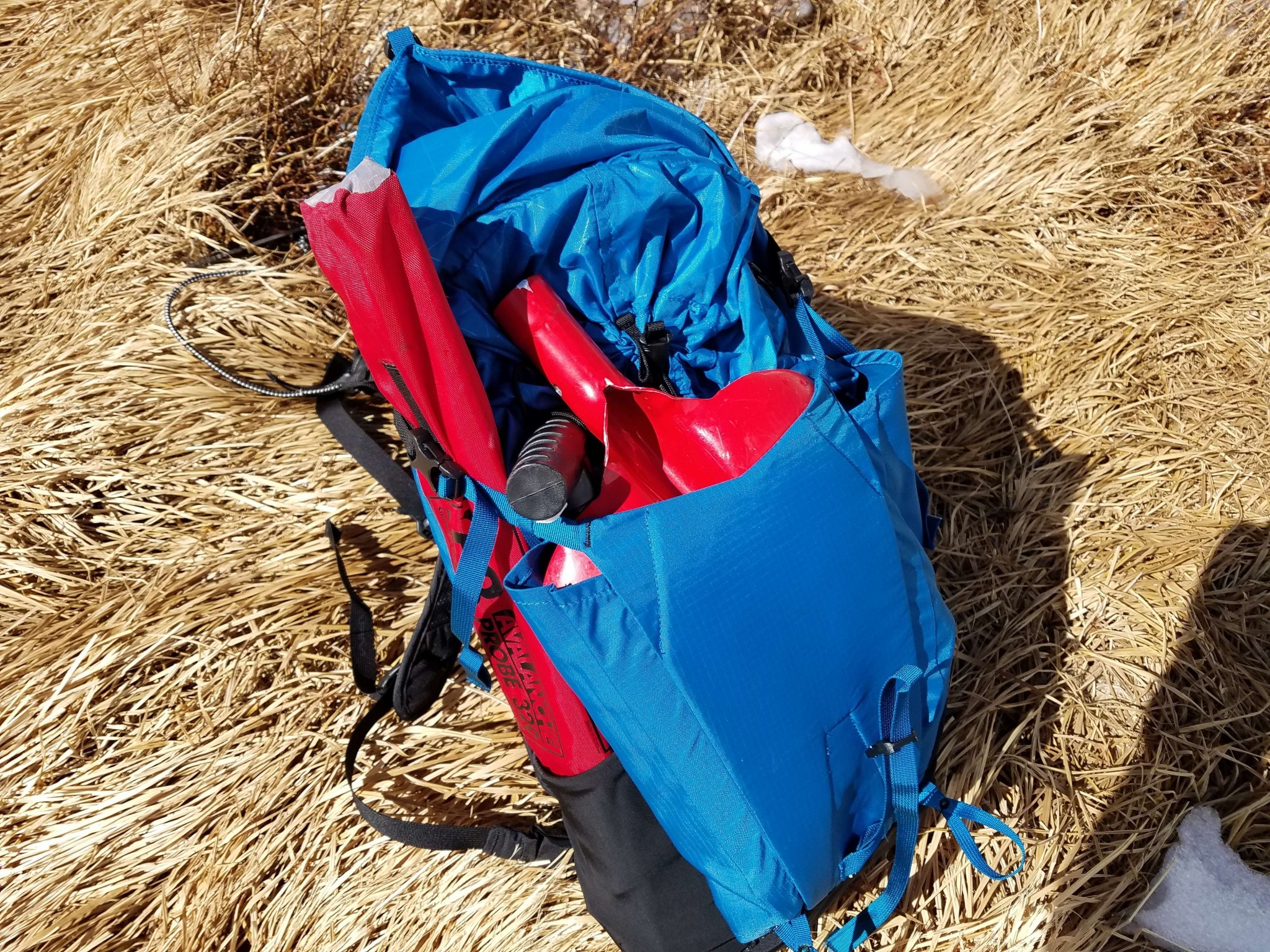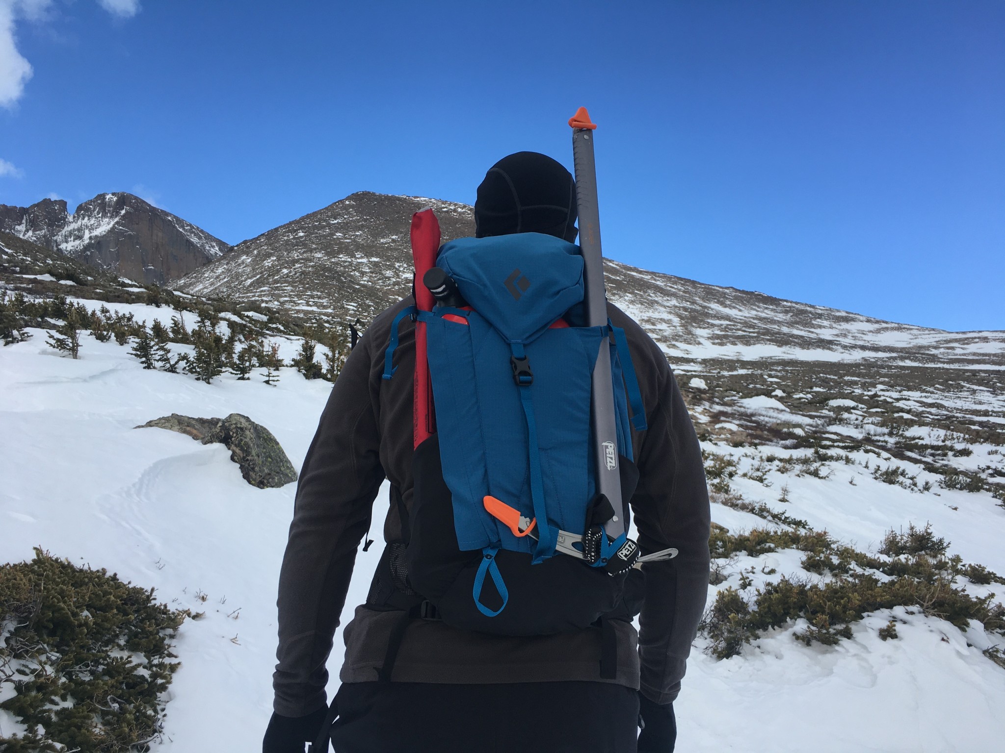 We were initially put off by the lack of bungee pole/axe carriers, or lower compression straps on the Bolt 24. However, the upper compression straps, well-placed ice axe loops, and generously sized crampon pocket make it easy to carry pretty much any gear you might need for a day in the mountains. We found it easy to pack for anything from a short day hike to a day in the backcountry with an axe, shovel, probe, and microspikes all easily stored on or in the pack