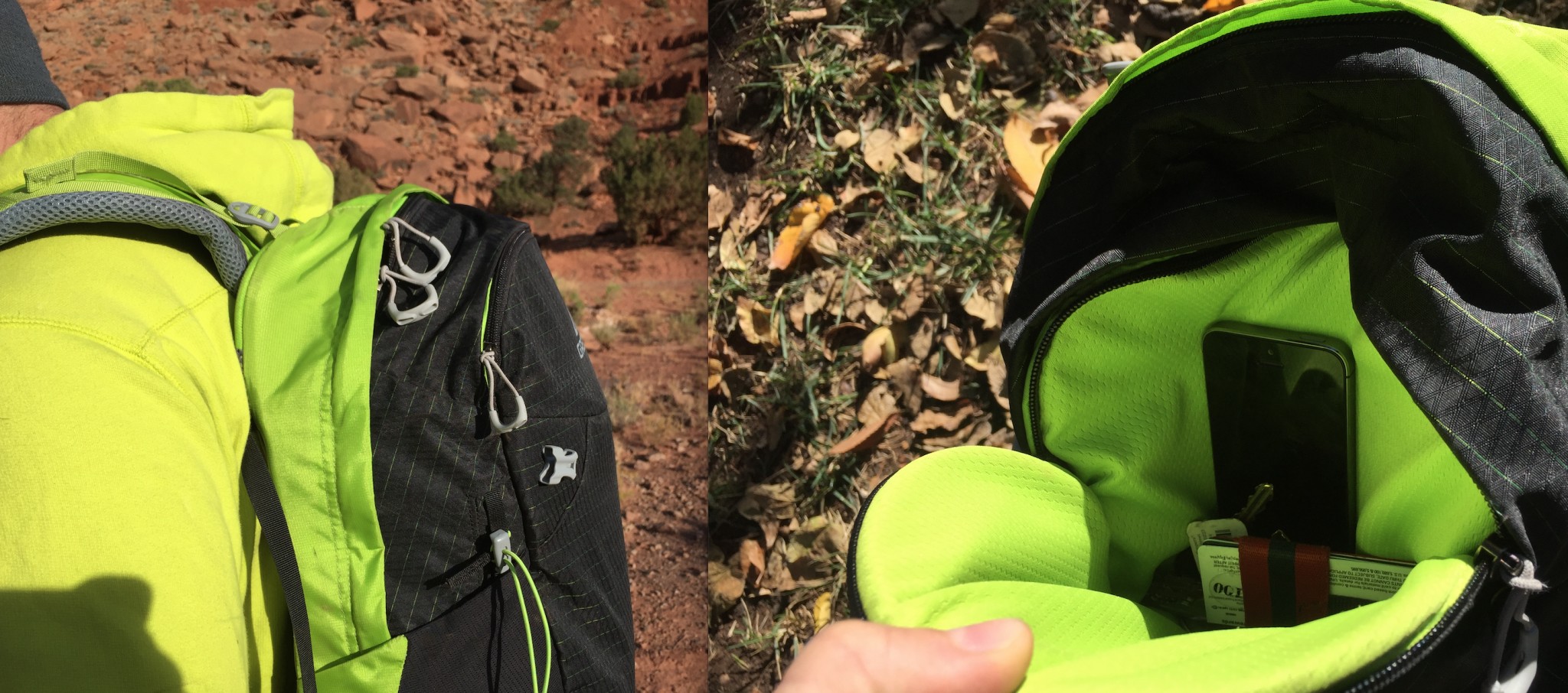 Another feature to note is that the top zipped pockets are generously sized and lined with a smooth neon fabric that is soft to the touch; this helps to distinguish items hidden within. The interior of the pack contains a hydration sleeve and zipped mesh pocket with a key clip, while the panel loading design opens nice and wide for easy access to items hidden at the bottom. The water bottle pockets are stretchy and easily fit a standard 1 liter Nalgene. The shoulder strap has a hydration hose retainer and a super cool holder for your sunglasses.