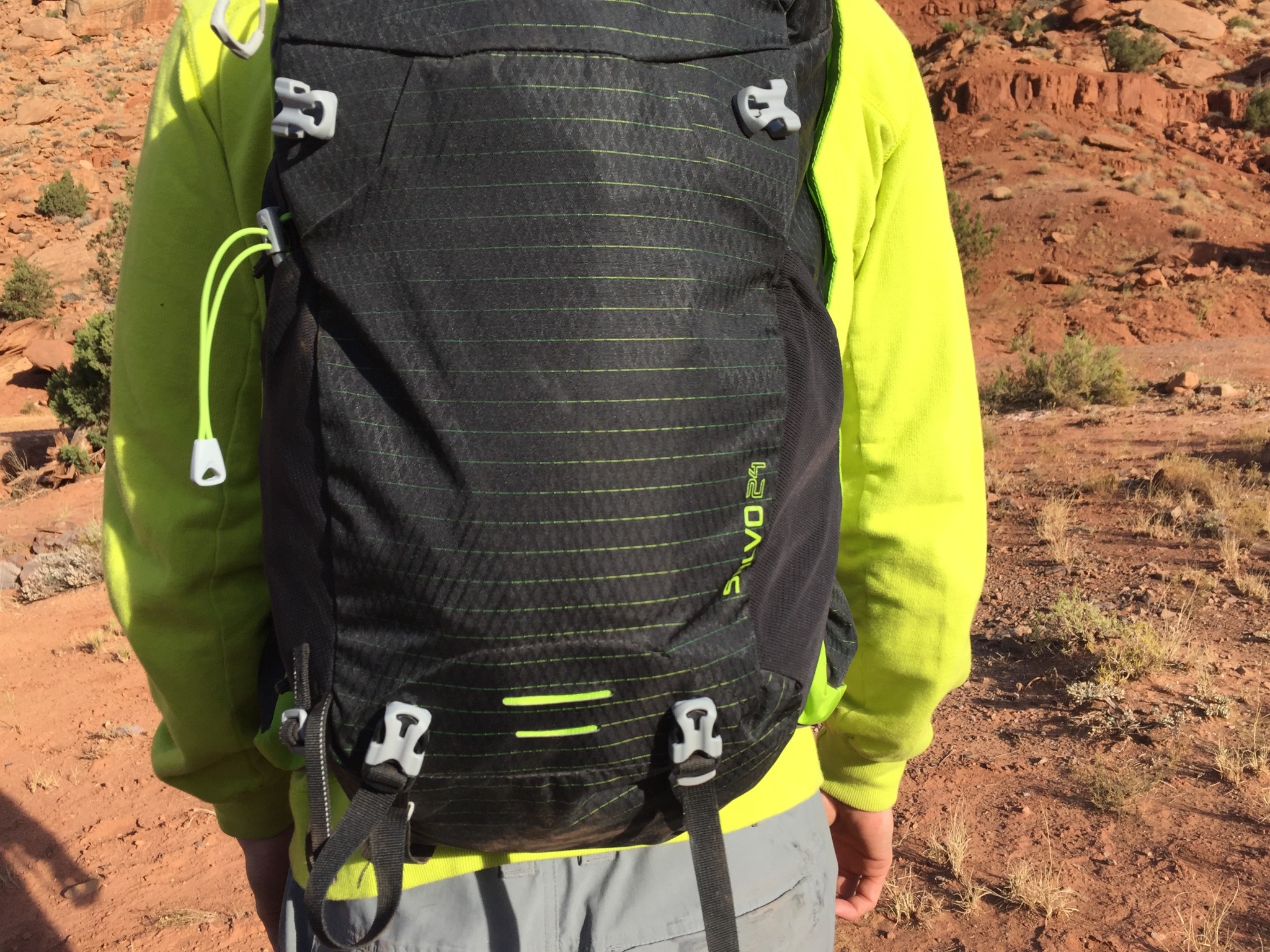 Thankfully, Gregory was aware of this fact and reinforced the nylon along the bottom edge of the stay. This high wear area contacts the ground every time you set the pack down. Along the rest of the edges, however, we expect the nylon to eventually wear through. Also, it is easy to imagine tearing the mesh back panel if it were to be pressed against the sharp edge of a snowshoe in the back of your car, for instance. In the end, we expect the Salvo to withstand the rigors of use if proper care is taken to protect its edges and mesh back panel. Consider the Deuter Speed Lite, Osprey Talon, or [Arc'teryx Cierzo 18] if you need a little more durability.