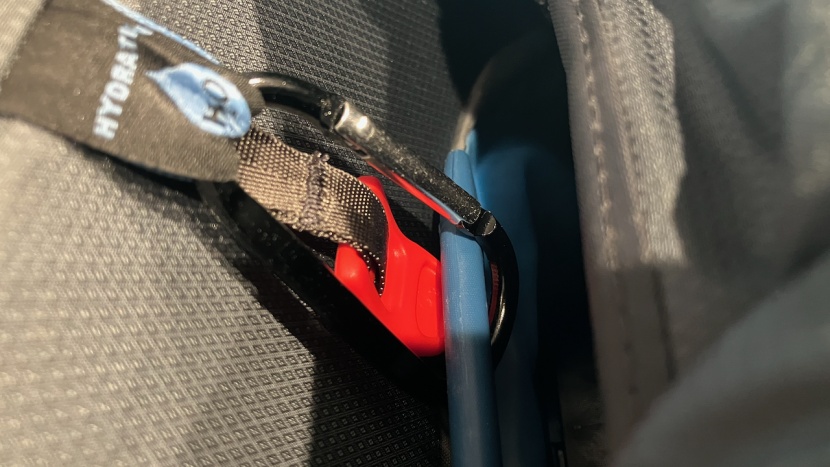 In previous versions of the Talon, the hydration compartment was on the outside of the pack, behind the back panel; it is now on the inside of the pack in the main compartment. The bladder is suspended by a small tab that threads through the slider on Osprey bladders. This feature works well for Osprey bladders, but is not universally compatible. We had to use a small carabiner to suspend a non-Osprey bladder in the sleeve because the tab was too small to hold our bladder.