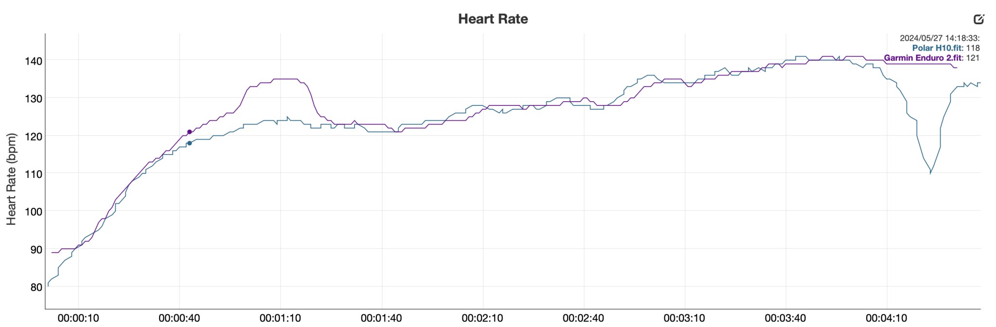 The Enduro 2 scored well in both GPS and HR accuracy, +/- 2.3 BPM and +/- 0.01 miles, making this one of the most accurate GPS tracks during our testing. While it doesn't have the latest HR sensor from Garmin, it does have multi-GNSS capabilities for added accuracy. During our testing, we found that the standard GPS across all watches performs well in most scenarios.