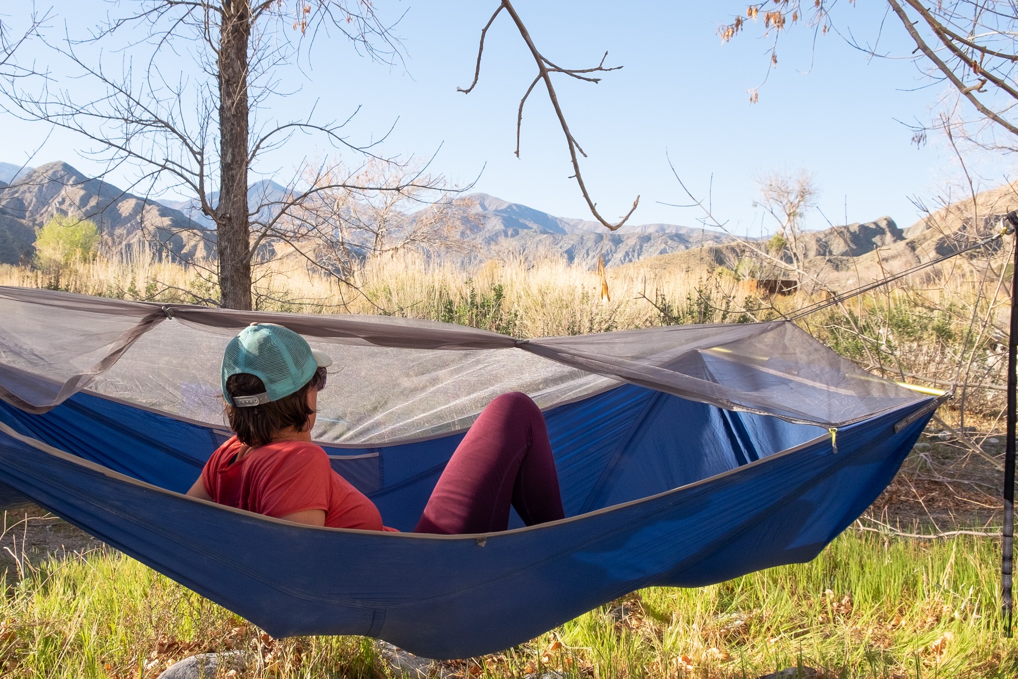 While it isn't the lightest model we tested nor the best for sitting in with a friend, the Skylite does offer a decent amount of versatility. It's light enough to be your backpacking shelter when paired with a lightweight tarp and the ENO Helios suspension, but is easy enough to set up for a quick hang in the park. Although, since the bug netting only rolls back halfway, there isn't space to sit sideways.