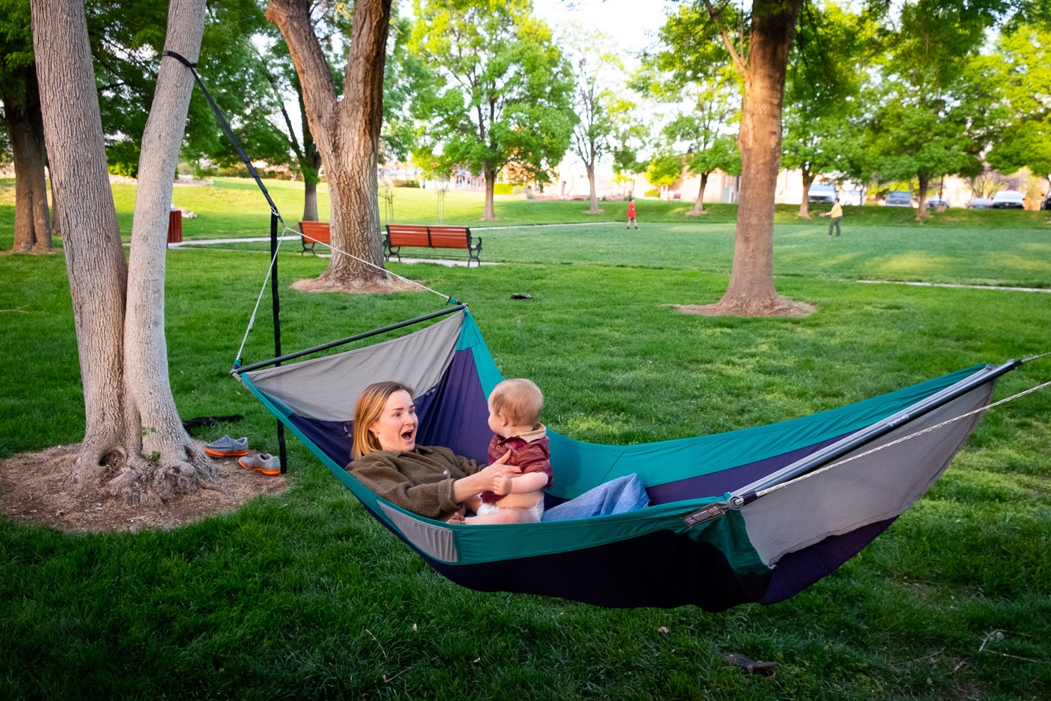 The simplicity of the Skyloft is best suited to slinging up at the park to read a book or nap. We love it because it is simple, comfortable, and easy to use.