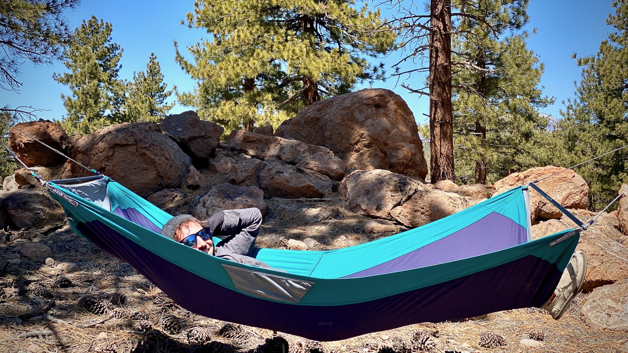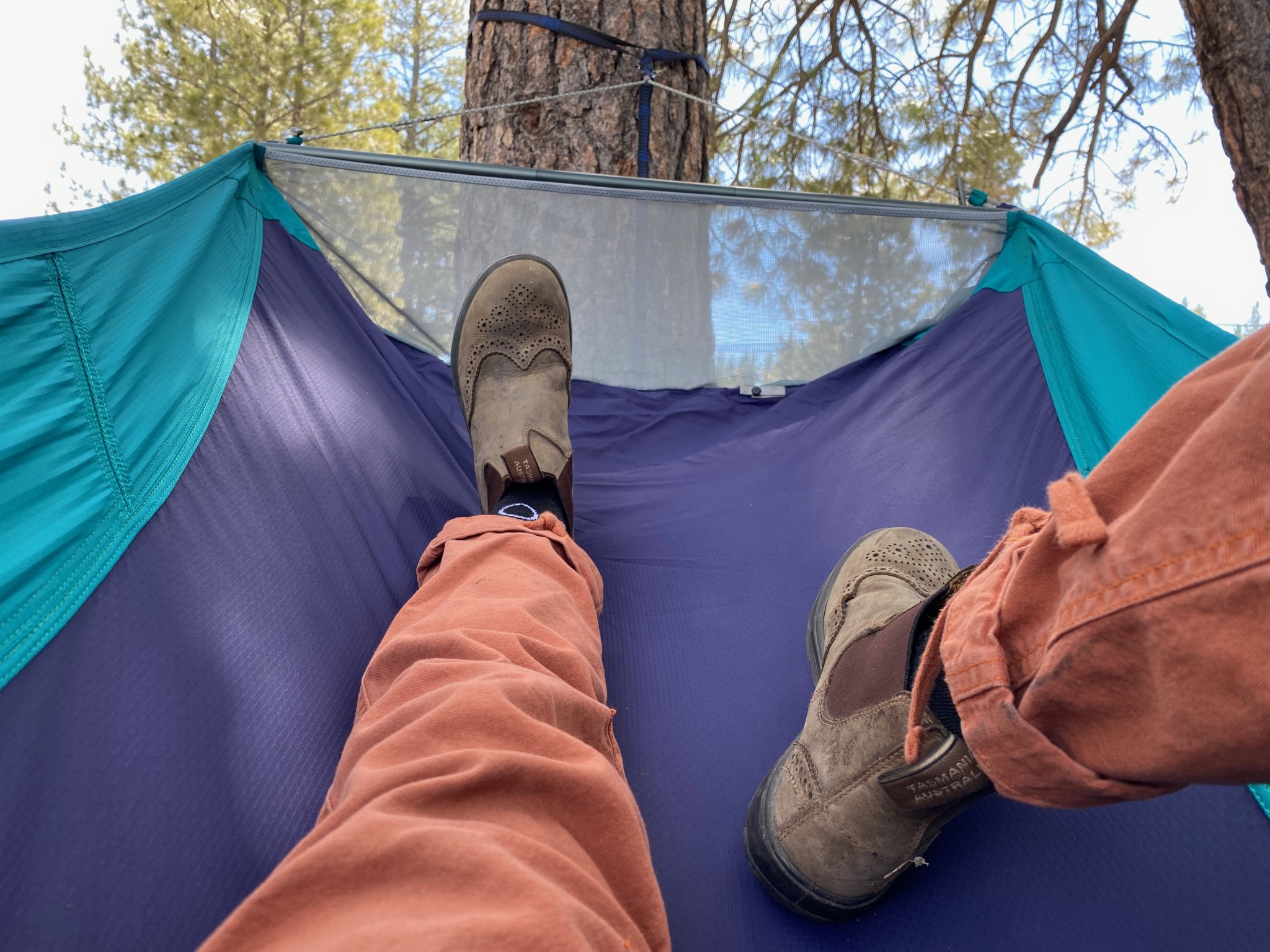 A cool feature that ENO added is a “whoopie sling” style of adjustment that lets you raise your head up a bit when you're not napping. When sleeping, you want your head at the same level as your body. But a reclining position is nice if you want to see out to the side, chat with friends, or read a book. With a little practice, we learned how to work the tensioner without ever leaving the comfort of our bed – which is what laying in this hammock truly feels like. The one thing we didn't love about the Skyloft was how topsy-turvy it feels when sitting up length-wise. Sideway sitting is comfortable and stable, but when we sat up in the other direction, the hammock felt wobbly if we didn't distribute our weight correctly.