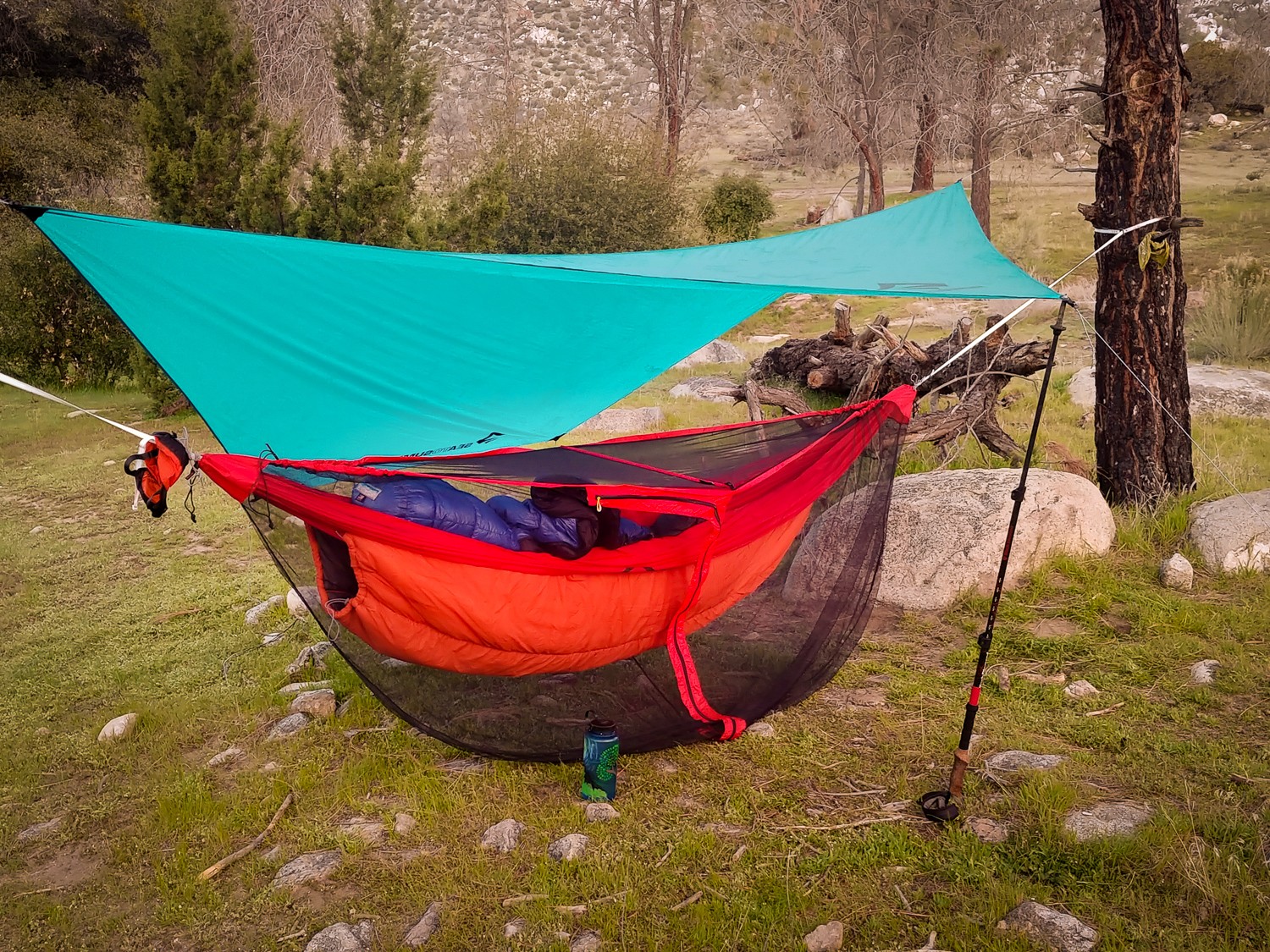 When using the Pro Double as a backpacking shelter with a rainfly, Sea to Summit's Hammock Tarp really shines. It is lightweight and easy to set up and adjust, thanks to built-in cord tensioners on each corner. Sea to Summit's tarp uses a 5-point shape that gives you more protection from the wind and blowing rain on one side of the hammock and more visibility on the other. You can set the hammock up so that the large side faces into the wind and enjoy the weight savings that come from not having an entirely rectangular tarp. The tarp is an excellent compromise between protection and weight savings.