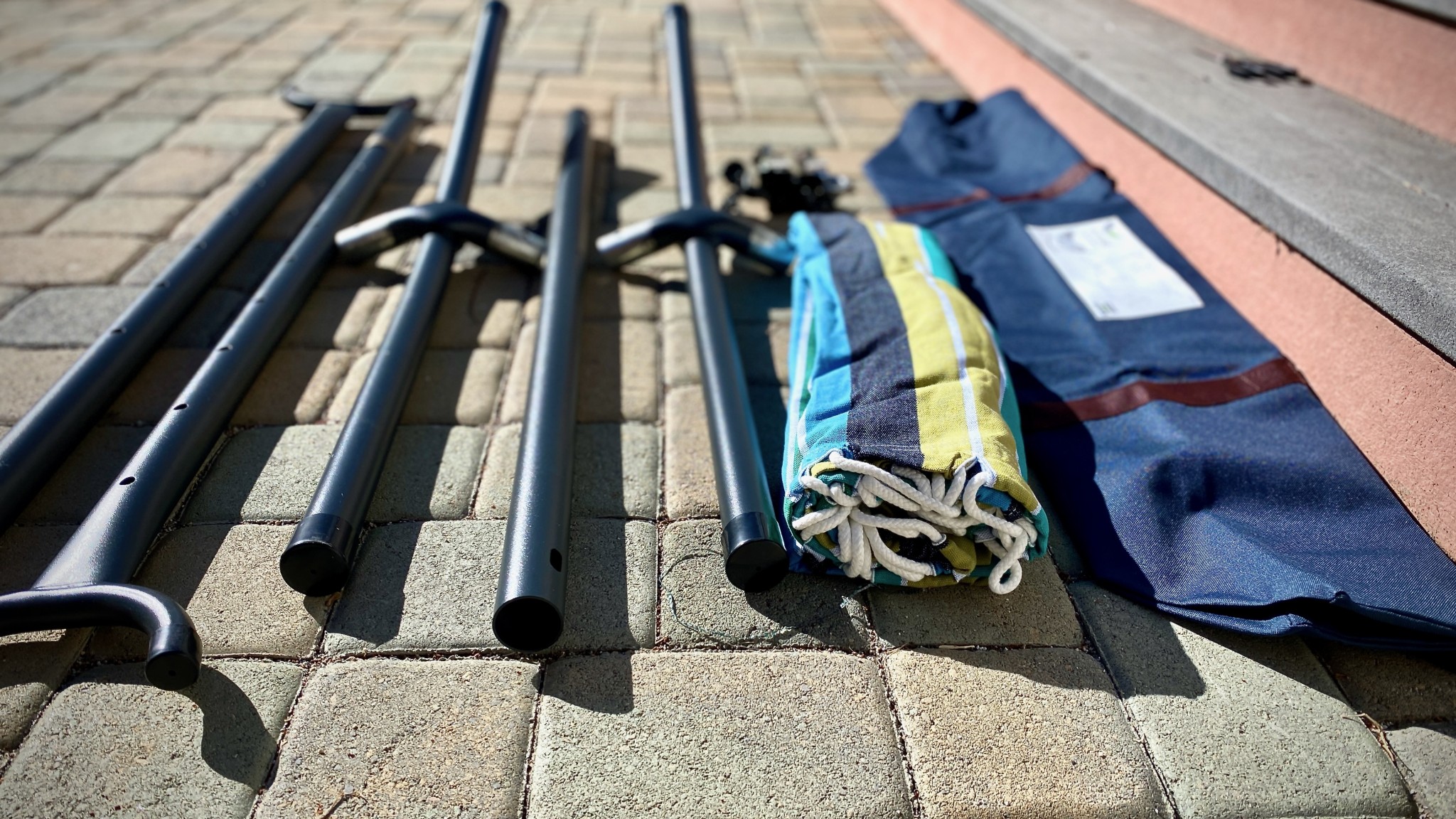 The Vivere Double Cotton setup includes the hammock itself, the steel frame with assembly hardware, and a carrying case. While our testing team could not initially set up this design without looking at the instructions, we found that we became increasingly efficient with each setup and breakdown. The first attempt required over 15 minutes; however, it was our first time setting up a freestanding hammock in this configuration, and we subsequently whittled down our time. That being said, this frame requires a bit of muscle and torque to properly align the holes that coincide on each piece of the frame before the poles can be properly attached and held in place. While initially somewhat frustrating, we ultimately appreciated the stability that it provided once we got the hang of it.