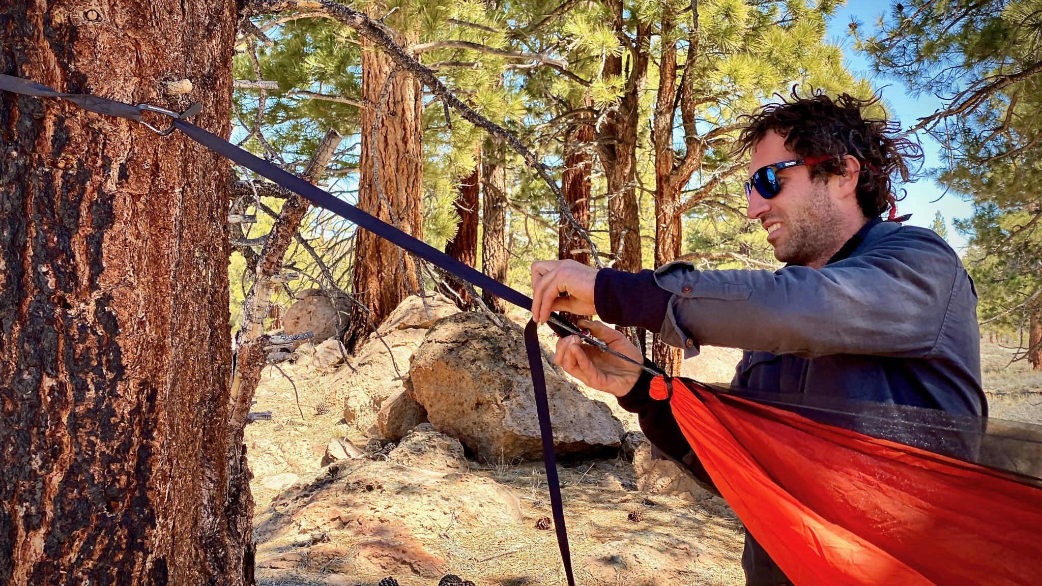 Both suspension systems include 15 feet of material and have a wide range of adjustability, giving the Warbonnet hammocks the largest range of the models we tested. The integrated bug net ridgeline is a much more user-friendly system than the separate pieces of sock-style bug netting. We are disappointed that the Blackbird does not include carabiners or stakes for the bug net guy lines. But, like all the other components, they are available on the website for an additional cost. We also learned the hard way that if you leave a twist in the webbing system, it will loosen as you lay in it until your bum rests on the ground. One issue to pay attention to is that the guy lines for the main hammock body tend to get tangled up when packing and unpacking. The manufacturer recommends zipping the lines on one side into the hammock interior before packing it away to help keep them separated. With all of these nuances, there is certainly a steeper learning curve to setting up this hammock than others we tested. But once we had it figured out, it became second nature.