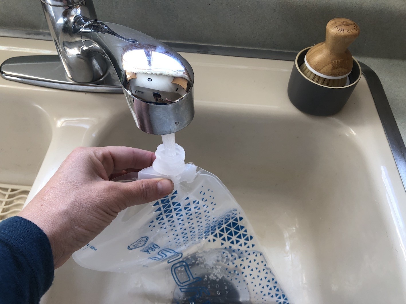 The only way to fill this bladder is through the screw-top on its bottom. The opening is relatively small, but it is simple to fill at the taps. While shallow sinks force you to crumple the bladder into a bunch at the bottom, we could still fill it quite easily. In deeper water sources, such as lakes, or when faced with a running source like a river, we still found it is easy to fill.